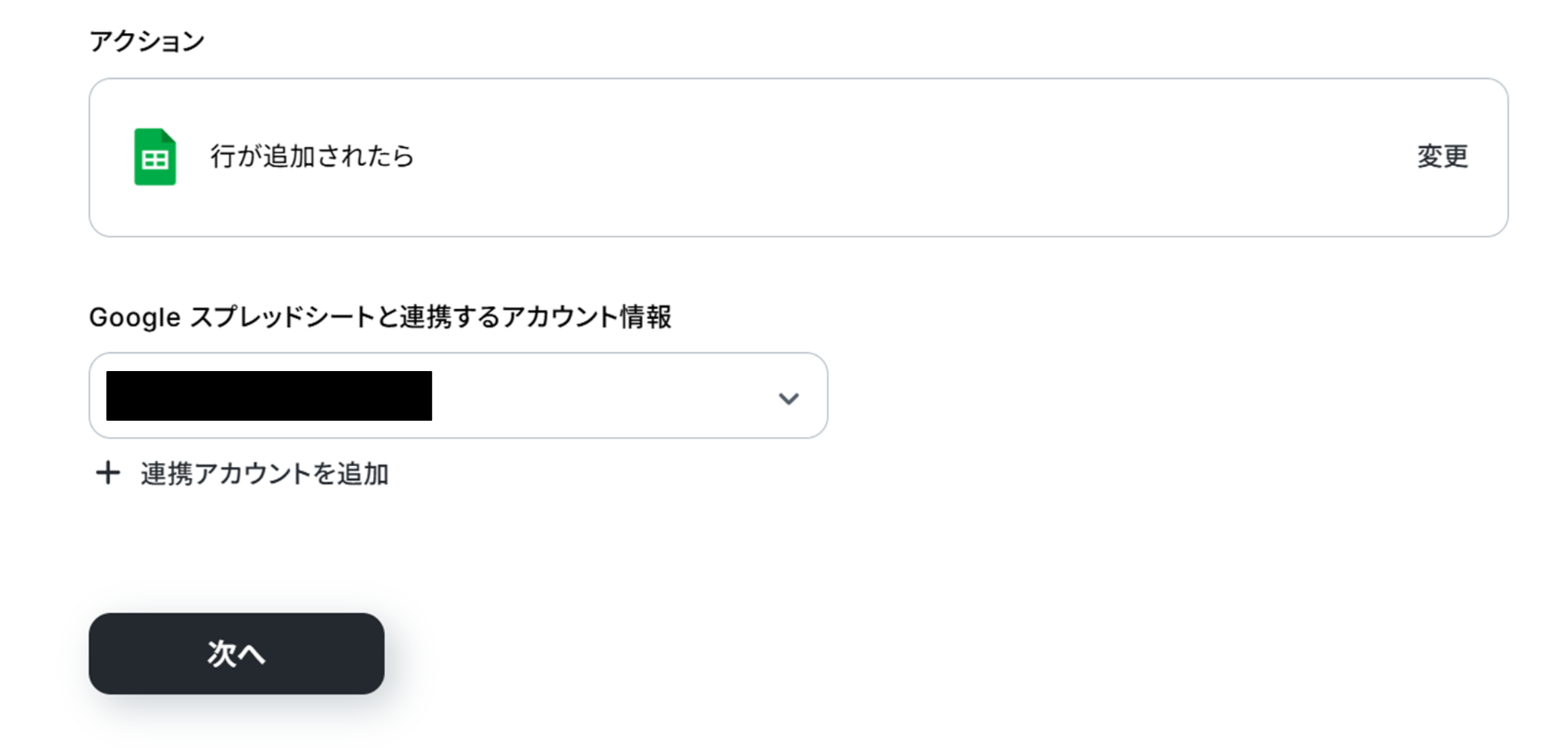 (2)「連携アカウントとアクションを選択」画面から、Google スプレッドシートと連携するアカウント情報に誤りがないかを確認し、アクションは「行が追加されたら」のままで「次へ」をクリックしましょう。
