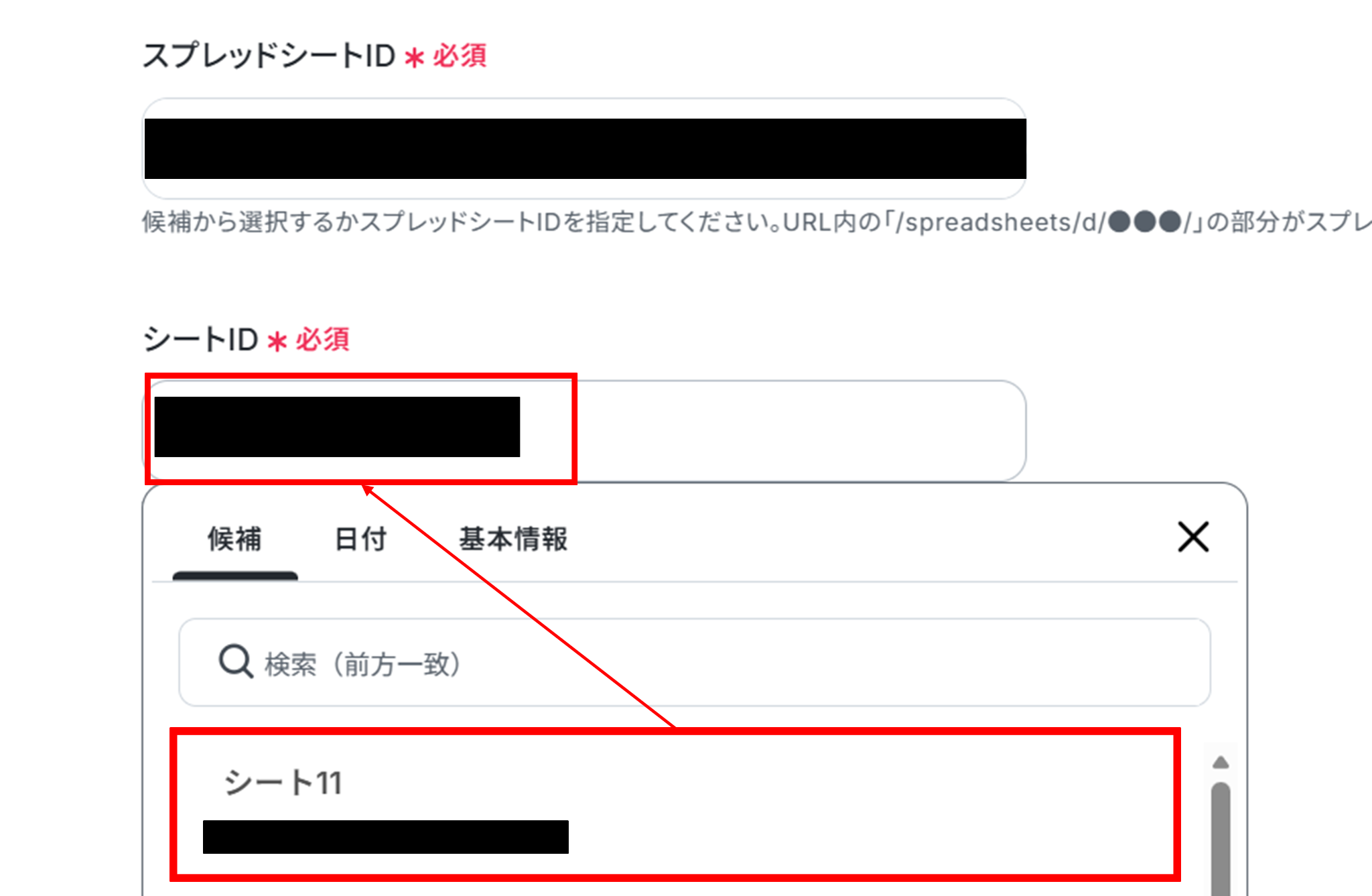 下へ進み、スプレッドシートIDとシートIDを候補から選択します。