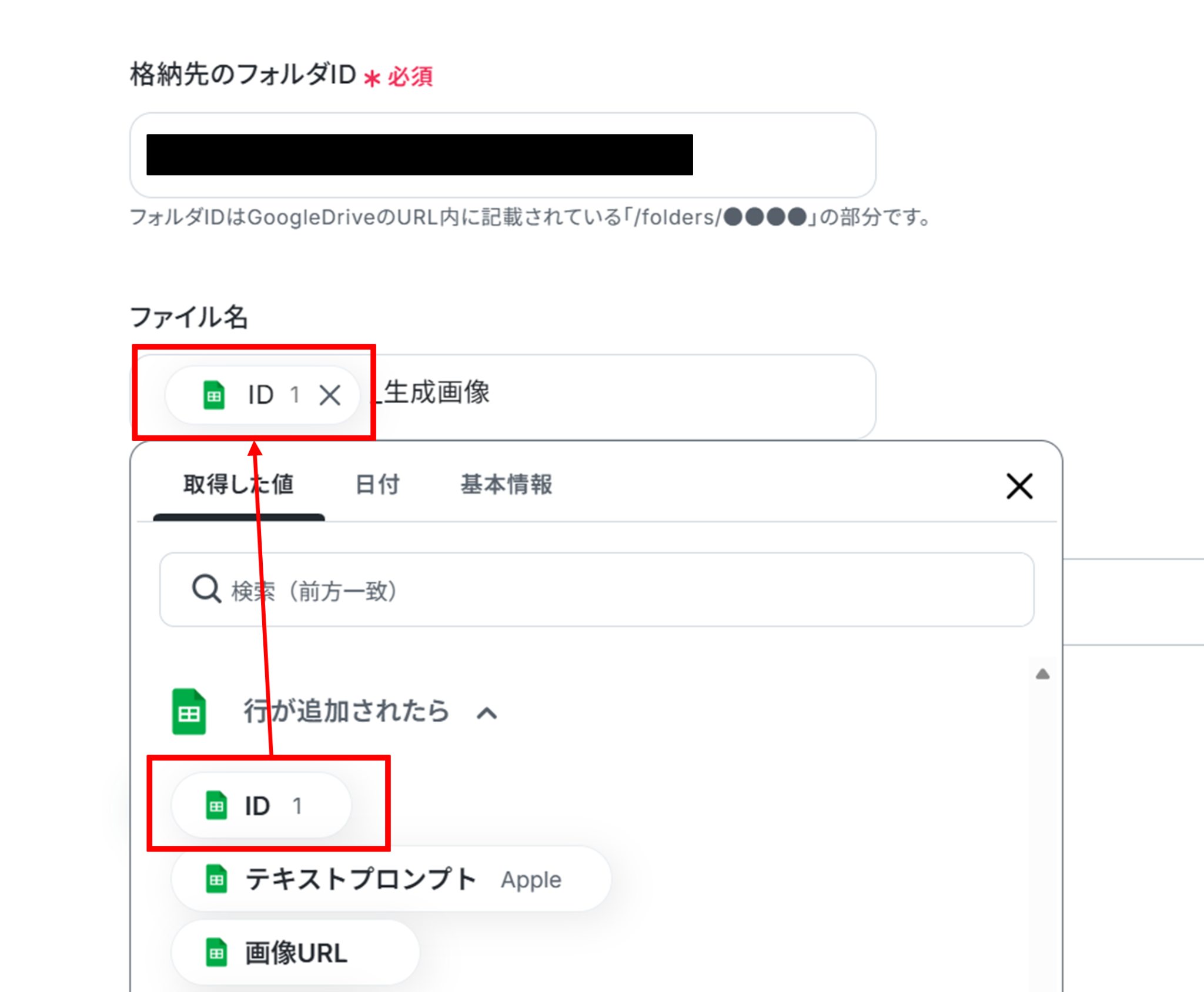 (3)「格納先のフォルダID」を候補から選択します。