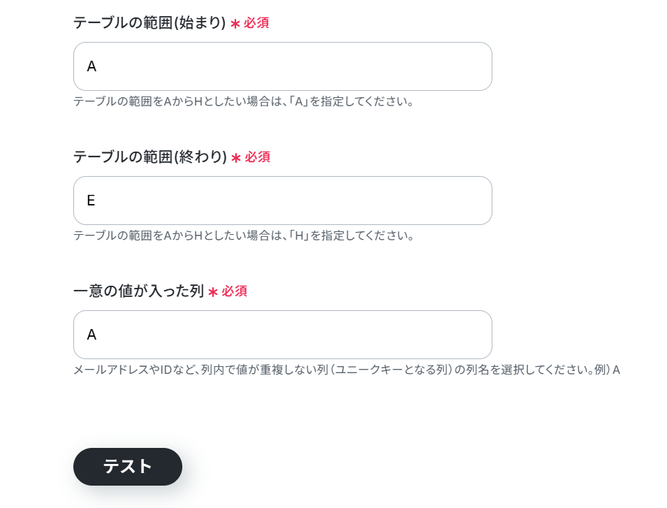 テーブル範囲は必須項目ではありませんが、Google スプレッドシートの範囲を指定したい場合は直接入力します。