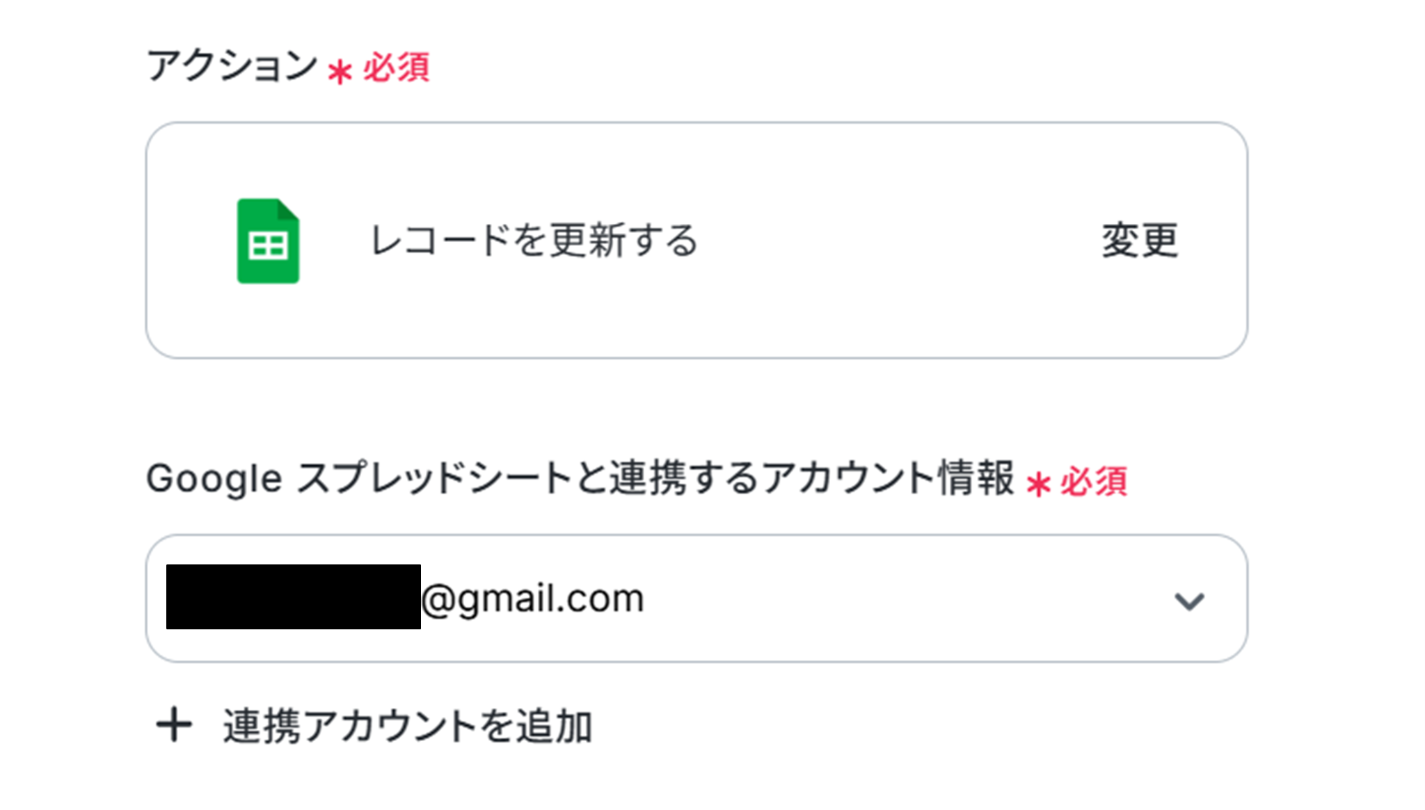 (2)「連携アカウントとアクションを選択」画面から、Google スプレッドシートと連携するアカウント情報に誤りがないかを確認し、アクションは「レコードを更新する」のまま下へ進みます。