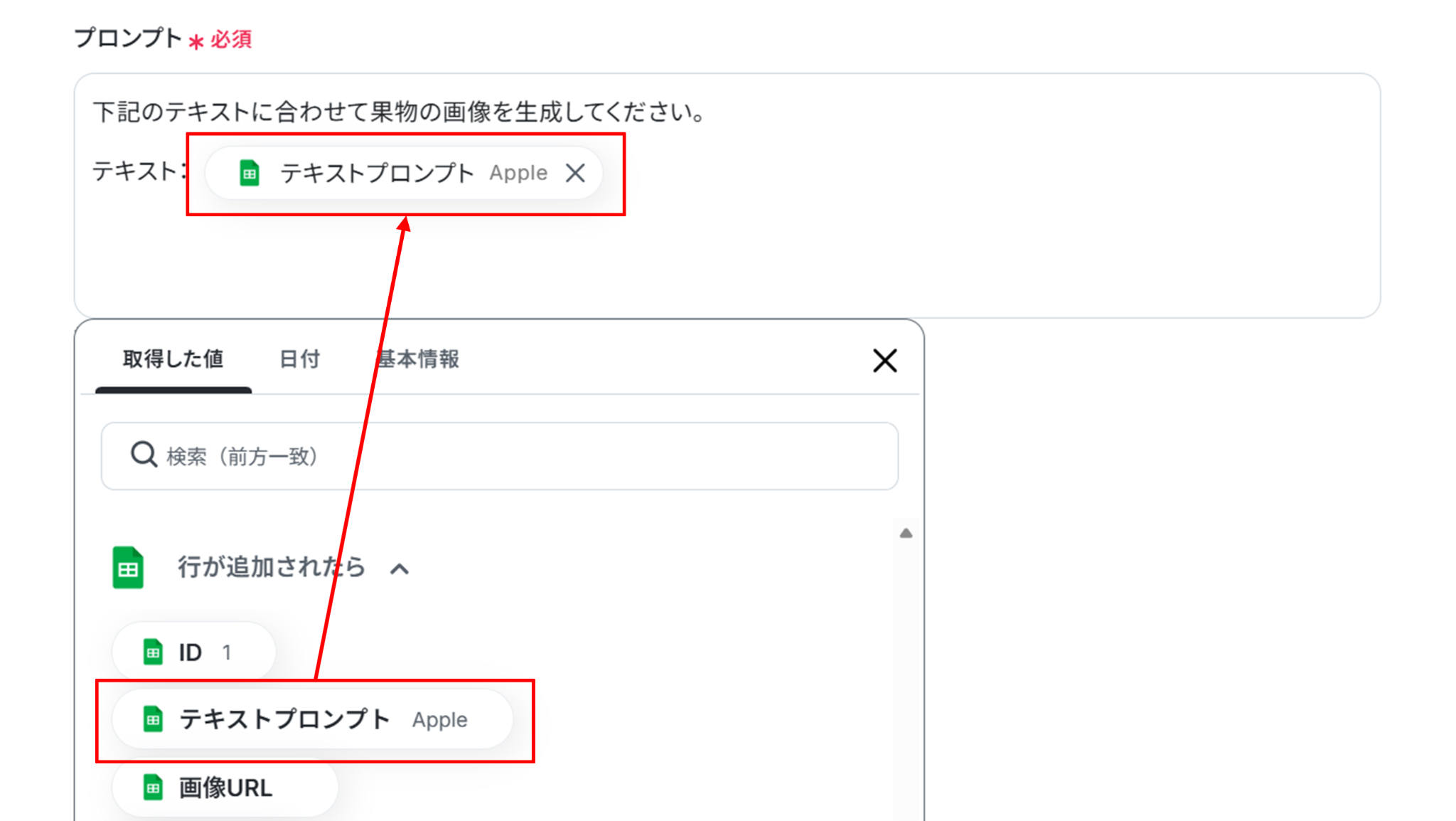 (3)プロンプトにGoogle スプレッドシートで取得した値を使って指示内容を自由に入力します。