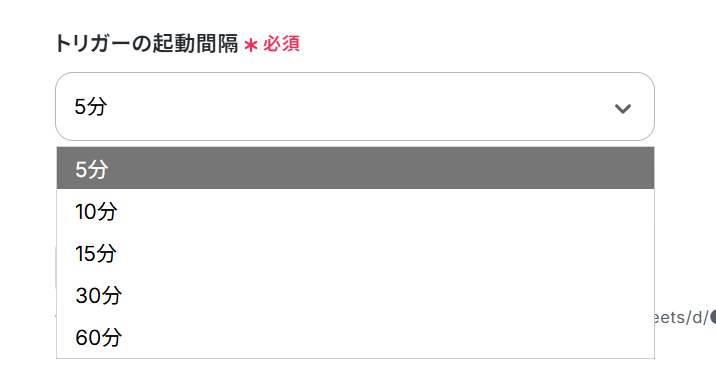トリガーの起動間隔はプルダウンより5分、10分、15分、30分、60分の間隔から選択してください。