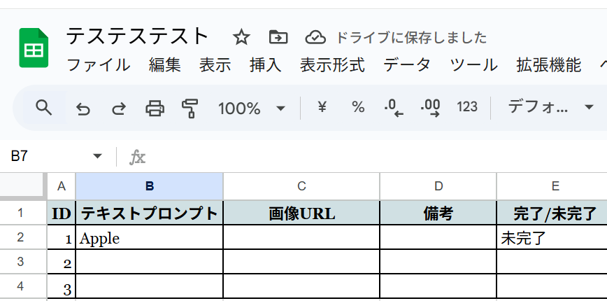 Yoomで設定をする前に、今回ご紹介するテンプレートはGoogle スプレッドシートに行が追加されることで起動するため、テスト用のGoogle スプレッドシートを作成します。