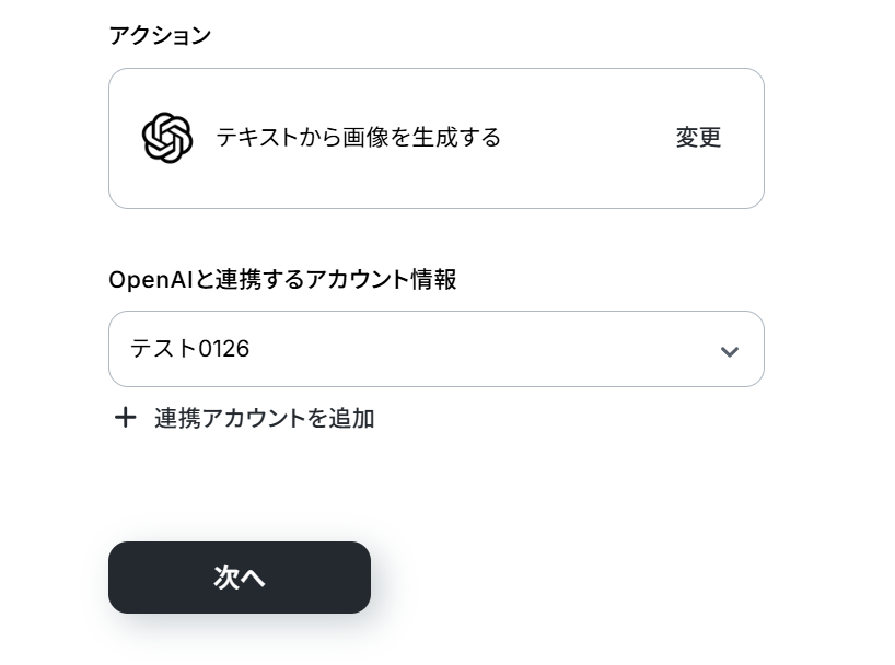 (2)「連携アカウントとアクションを選択」画面から、OpenAIと連携するアカウント情報に誤りがないかを確認し、アクションは「テキストから画像を生成する」のままで「次へ」をクリックしましょう。
