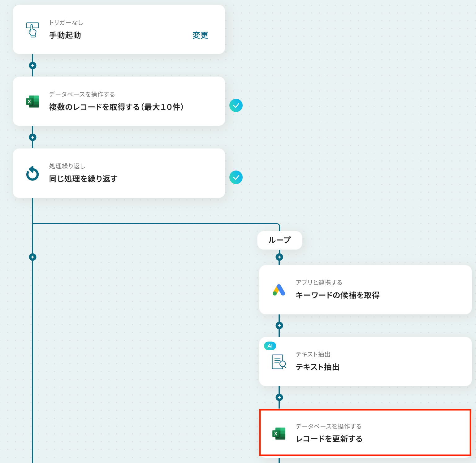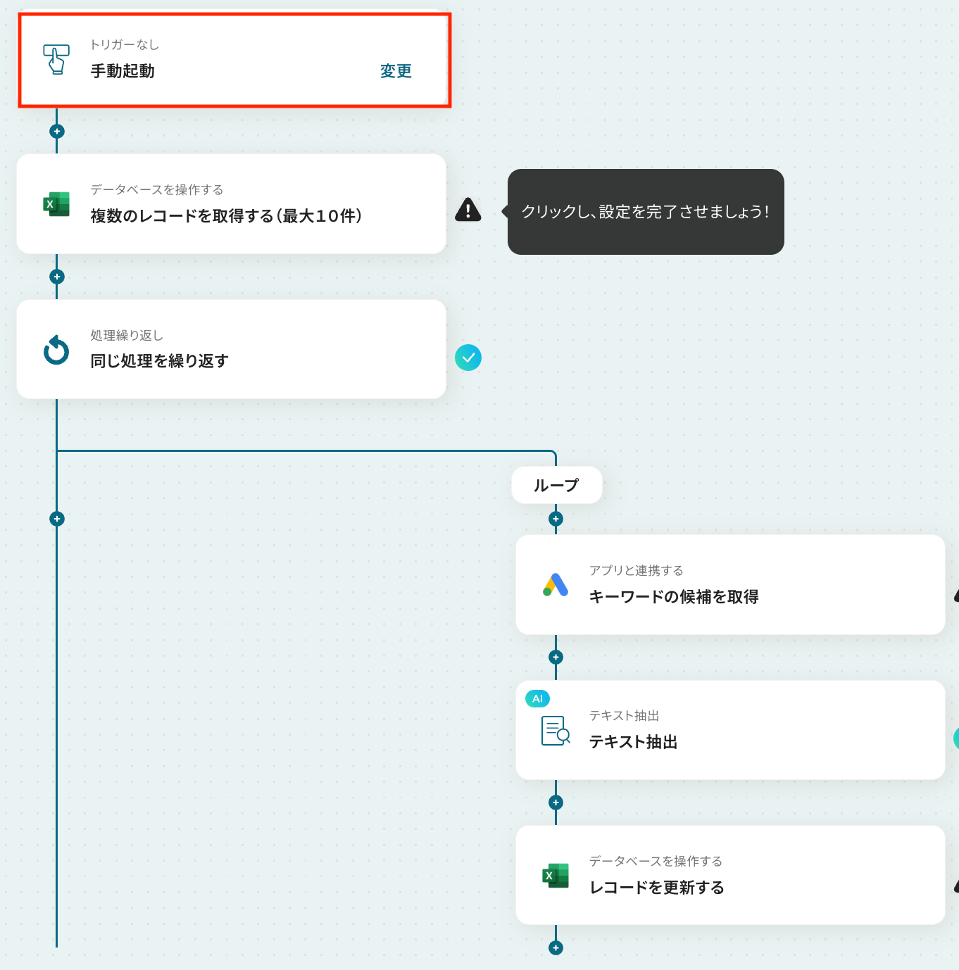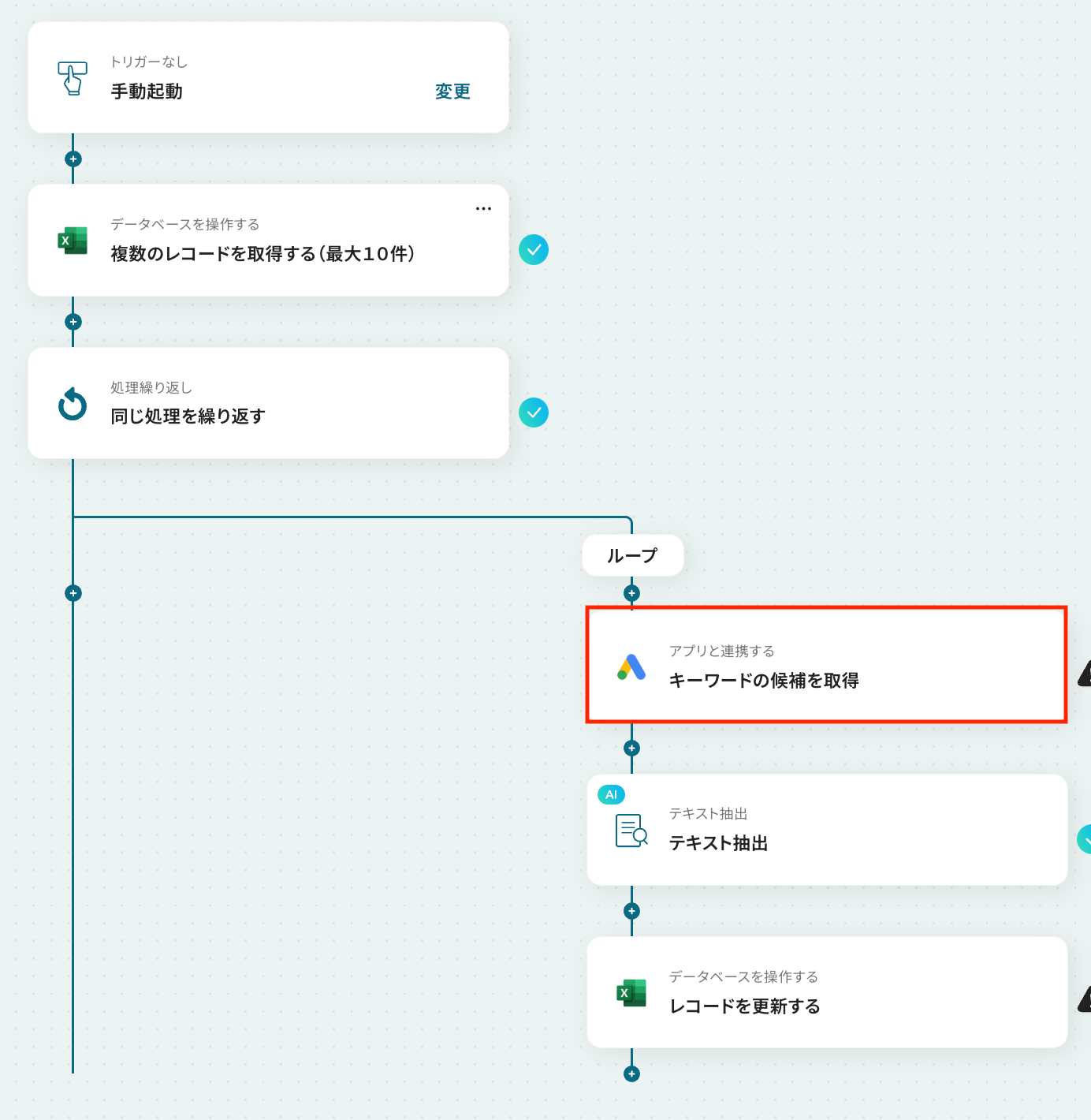 手動起動トリガーは、任意のタイミングでフローを開始させることが可能です。 Microsoft Excelでレコードを取得する際に、対象のファイルやシート、検索条件を任意で設定してください。 繰り返し処理機能では、前段のMicrosoft Excelで取得したどのデータをもとに処理を繰り返すか、条件を自由にカスタマイズできます。 Google Adsでキーワード候補を取得する際に、対象の広告アカウントIDや、候補生成の元となるキーワードを任意で設定可能です。 AI機能によるテキスト抽出では、Google Adsから取得した情報の中から、どの項目を抽出するかを柔軟に設定できます。 Microsoft Excelのレコードを更新する際に、どの項目にどの情報を書き込むか、変数や固定値を用いて自由に割り当てることができます。 ■注意事項