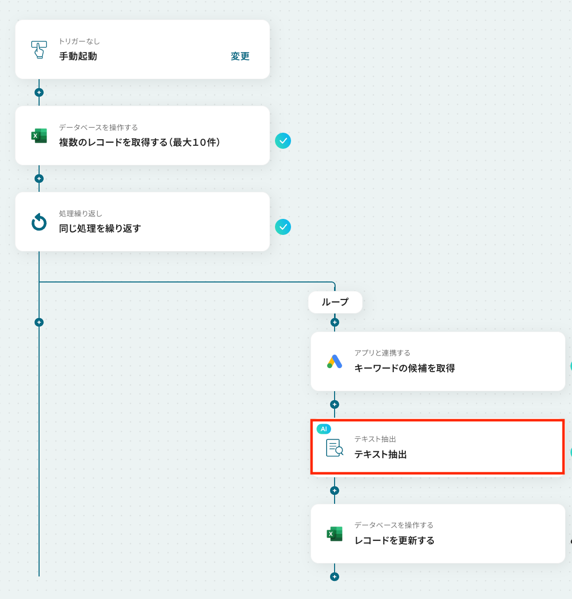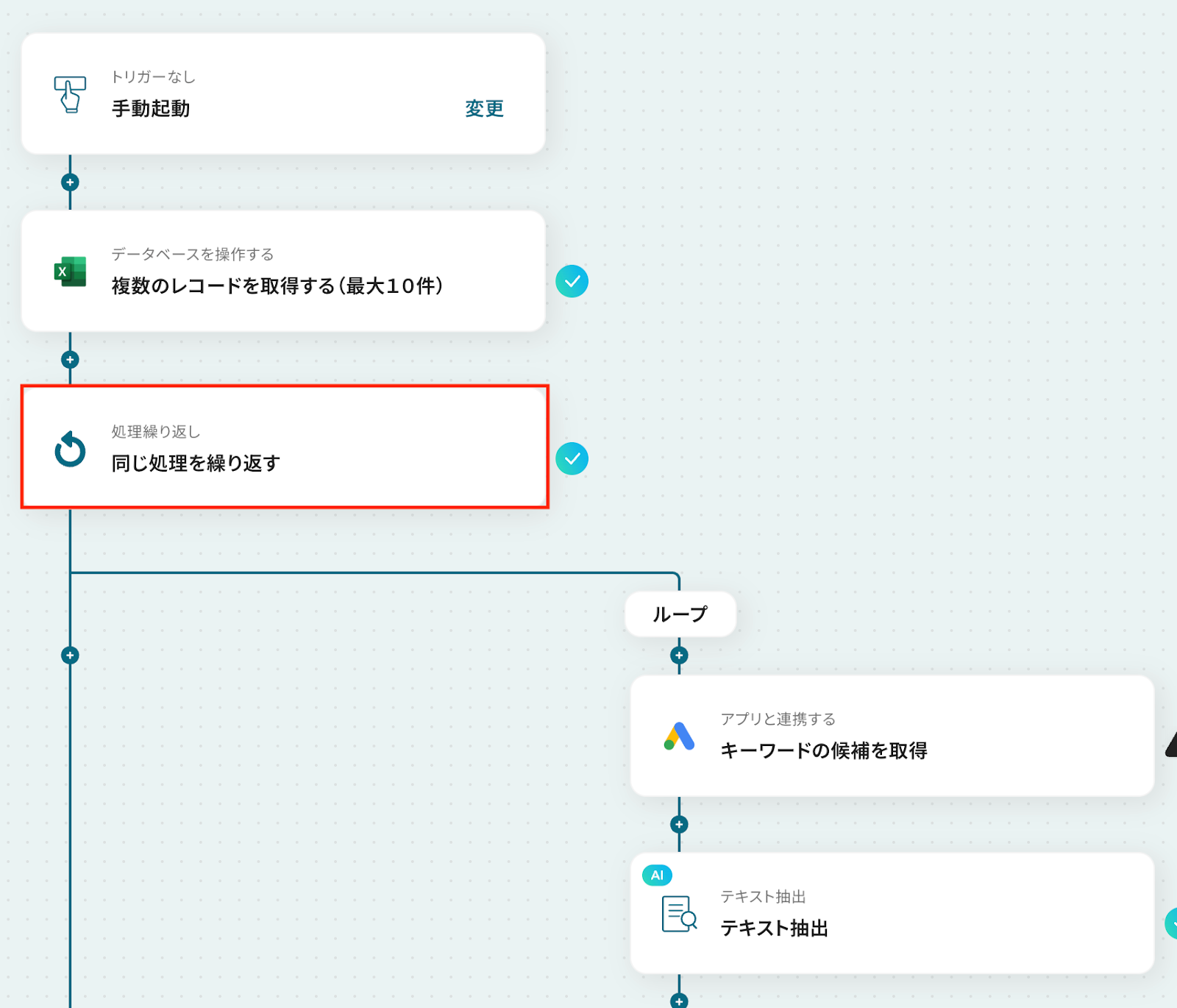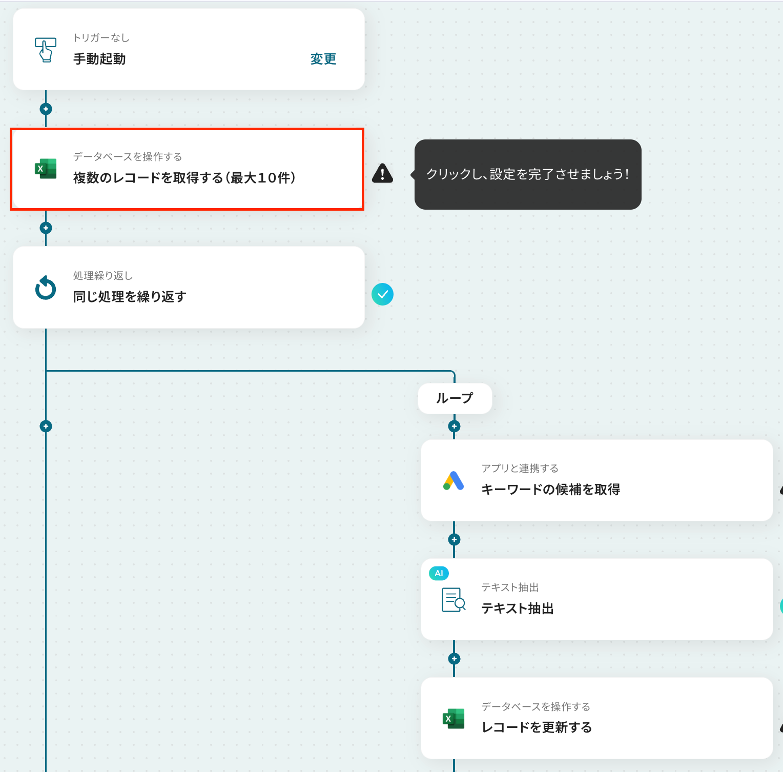 手動起動トリガーは、任意のタイミングでフローを開始させることが可能です。 Microsoft Excelでレコードを取得する際に、対象のファイルやシート、検索条件を任意で設定してください。 繰り返し処理機能では、前段のMicrosoft Excelで取得したどのデータをもとに処理を繰り返すか、条件を自由にカスタマイズできます。 Google Adsでキーワード候補を取得する際に、対象の広告アカウントIDや、候補生成の元となるキーワードを任意で設定可能です。 AI機能によるテキスト抽出では、Google Adsから取得した情報の中から、どの項目を抽出するかを柔軟に設定できます。 Microsoft Excelのレコードを更新する際に、どの項目にどの情報を書き込むか、変数や固定値を用いて自由に割り当てることができます。 ■注意事項