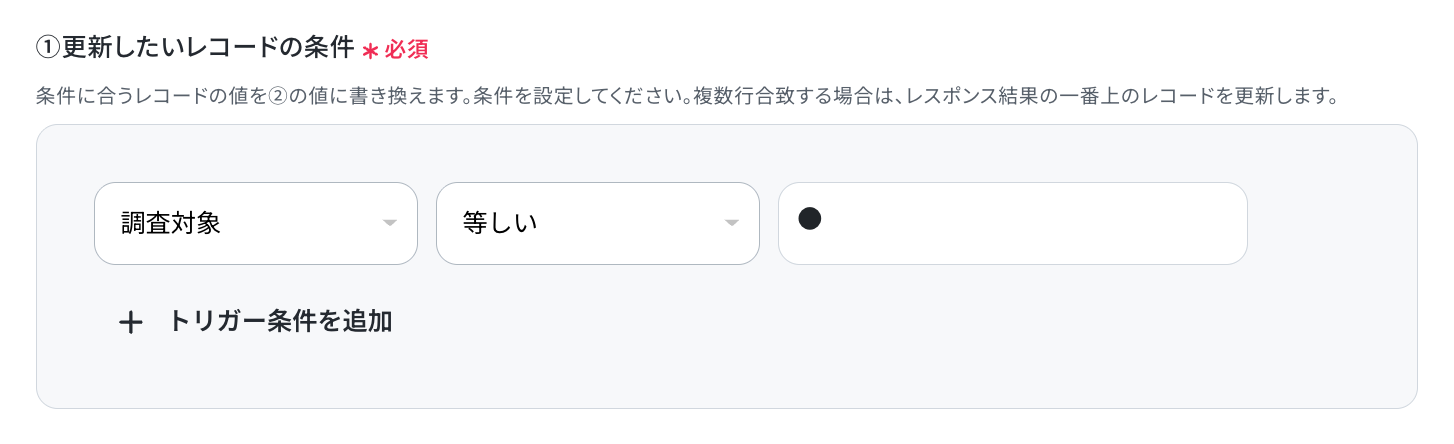 今回は、Microsoft Excelの対象ファイルから、調査対象の列に丸(●)が入っているレコードだけを更新するように設定します。 そのため条件として、「調査対象」「等しい」「●」を設定しました。