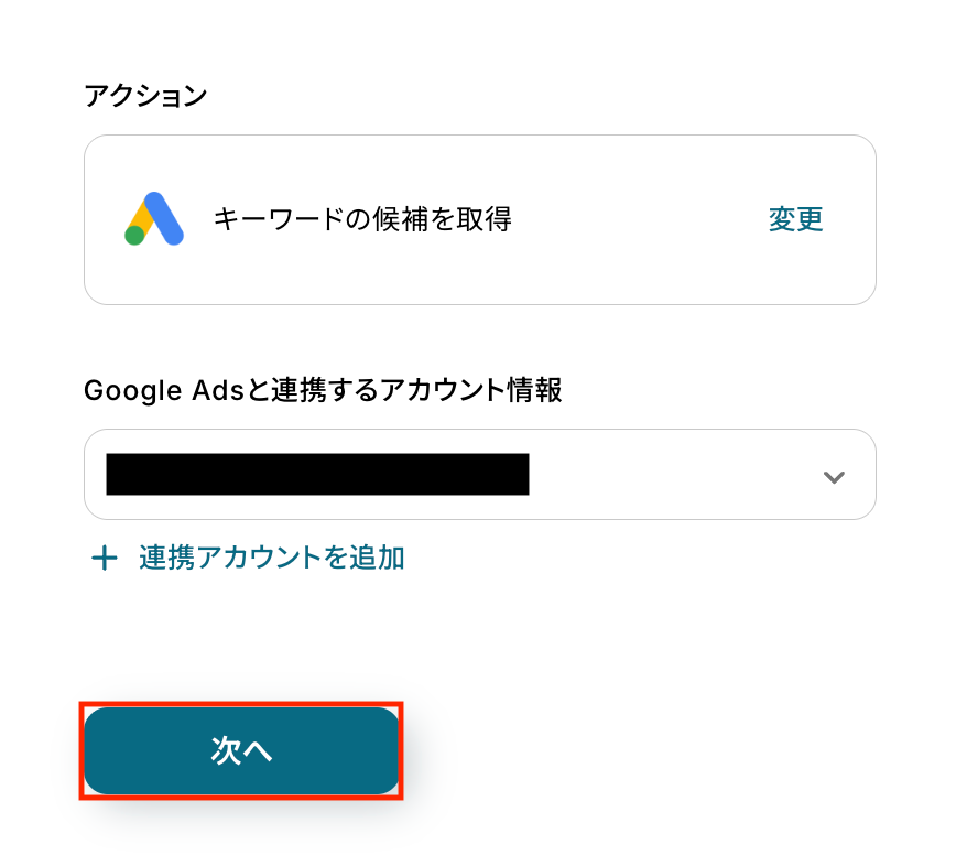 アクションはあらかじめ設定されているため、そのまま内容を確認してください。 Google Adsと連携するアカウント情報に問題がなければ、「次へ」をクリックします。