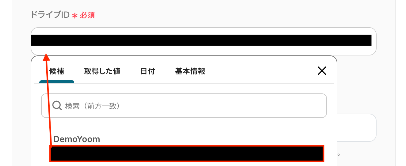 ドライブID、アイテムID、シート名 は入力欄をクリックすると候補が表示されるので、それぞれ対象の項目を選択しましょう。