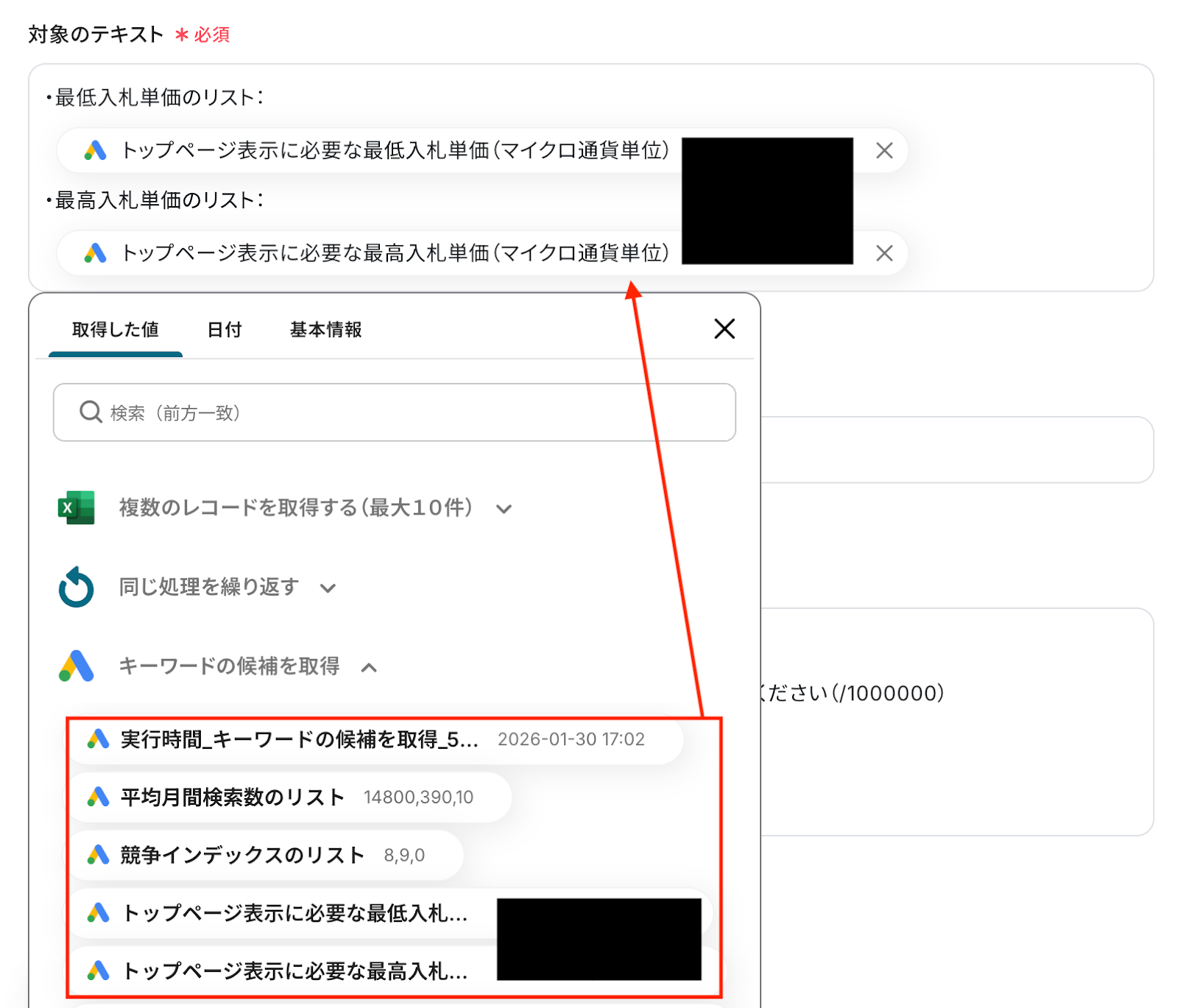 対象のテキスト 入力欄をクリックすると、前のステップでGoogle Adsから取得した値が表示されるので、選択して入力しましょう。