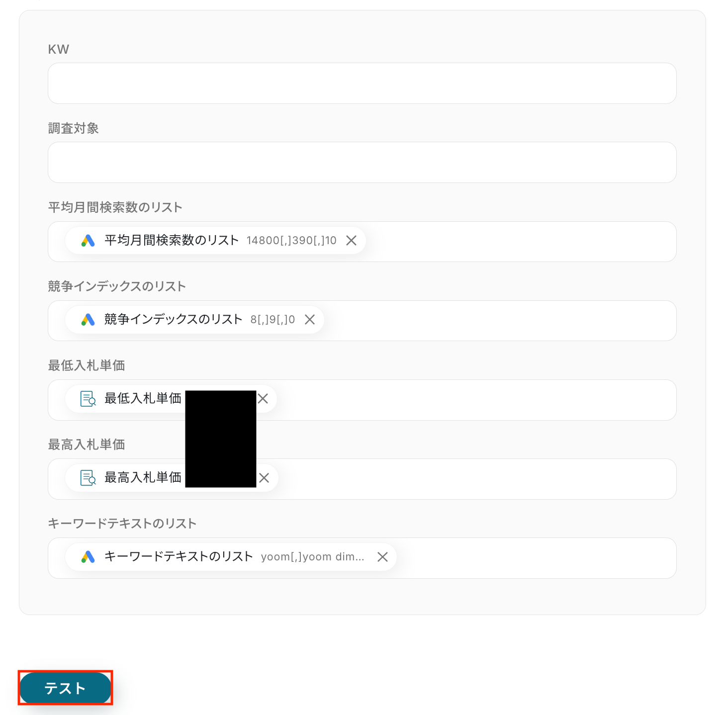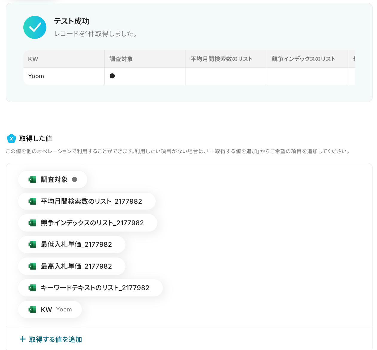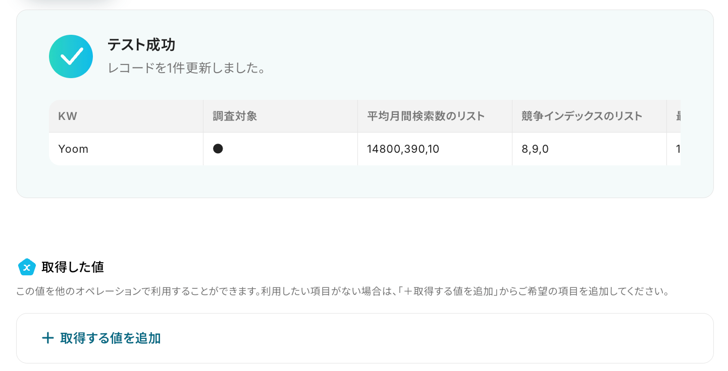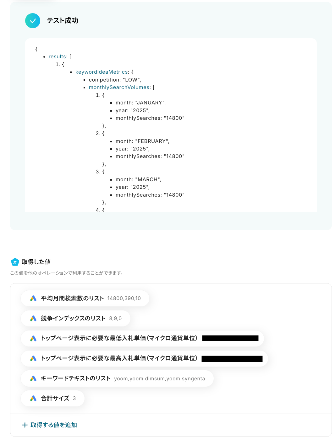 テストに成功すると、Google Adsのキーワードの候補に関する情報が表示されます。 以下の取得した値はこの後のステップで利用できます。