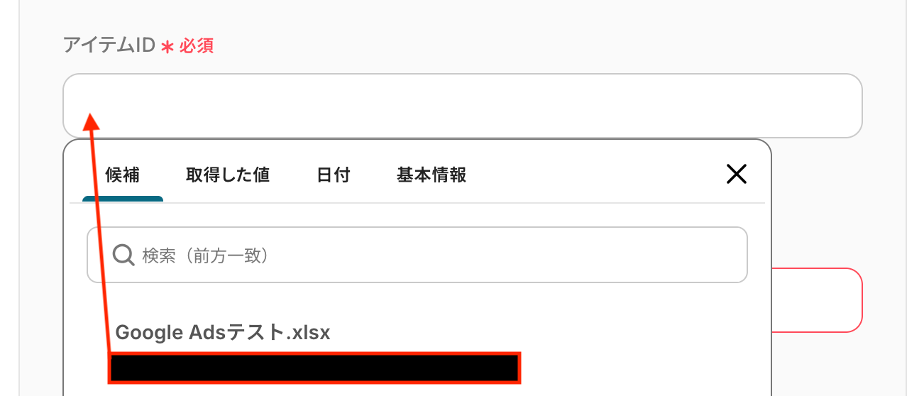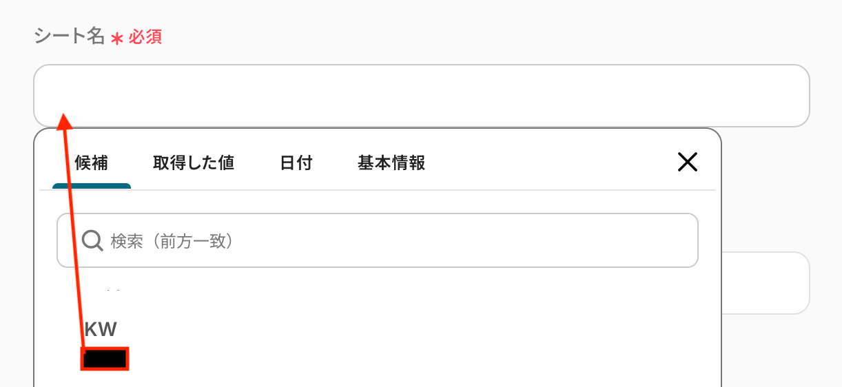 入力欄をクリックすると、前のステップで取得した値が表示されるので、選択して入力しましょう。