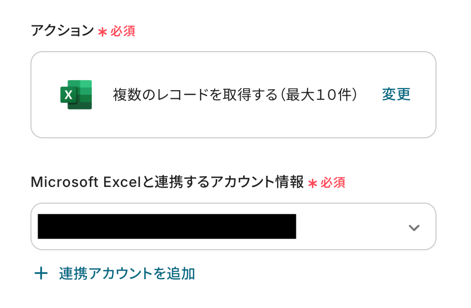 ステップ4:Microsoft Excelで複数のレコードを取得 続いて、キーワード候補の元データを取得するため、Microsoft Excelからレコード(複数)を取得しましょう。 「複数のレコードを取得する」をクリックします。