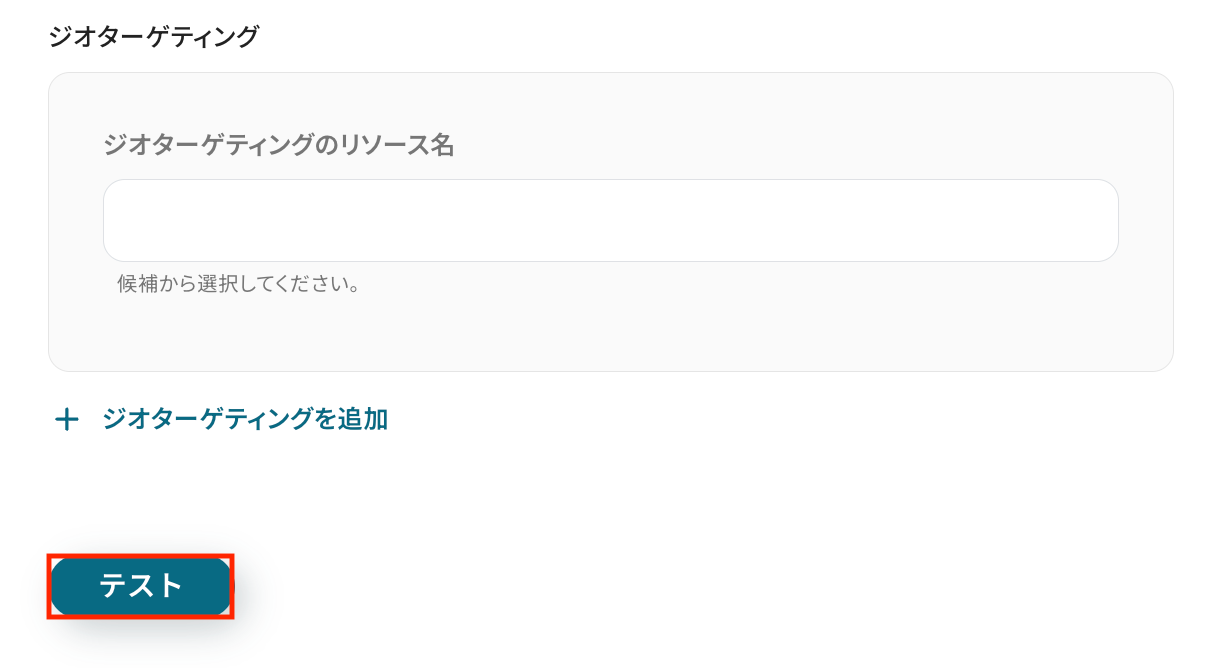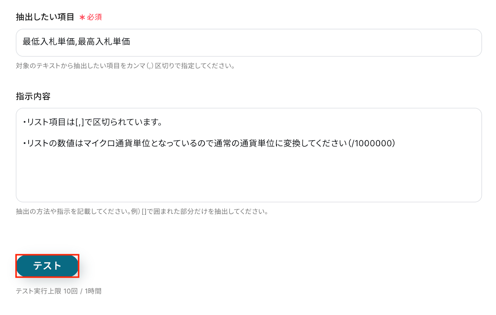 入力が完了したら、設定した項目が実際に正しく抽出されるかどうかを確認するため「テスト」をクリックしましょう。