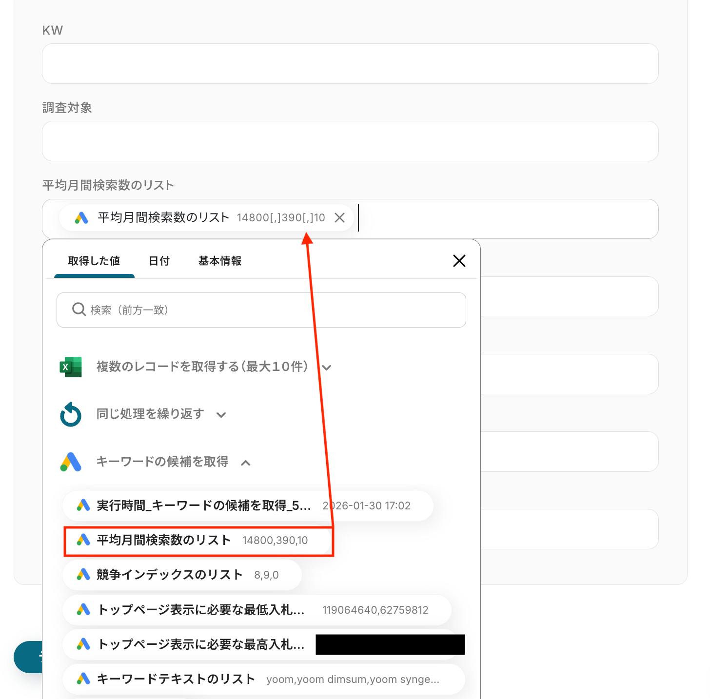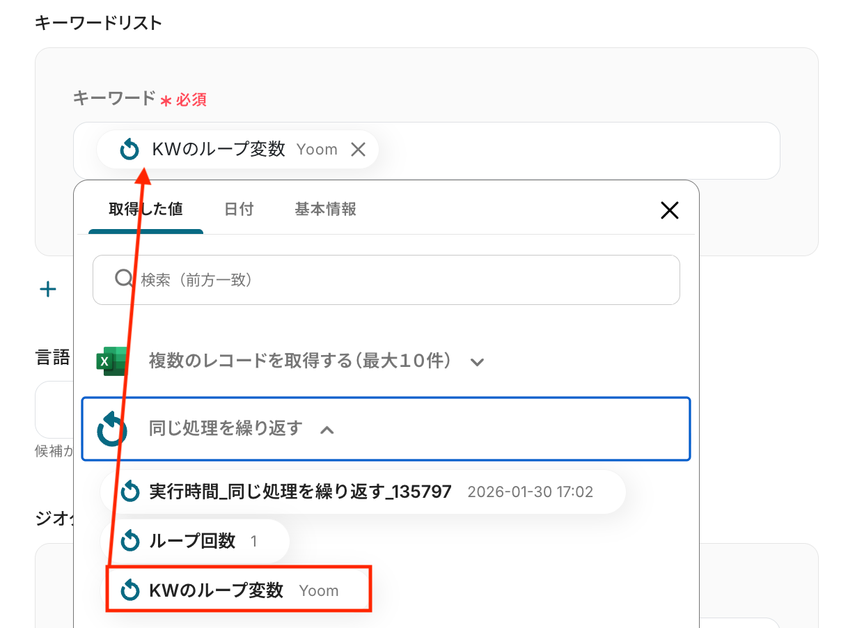 キーワードリスト 入力欄をクリックすると、「同じ処理を繰り返す」で取得した値が表示されるので、選択して入力しましょう。 取得した値を活用することで値が固定化されず、フローボットを起動するたびに最新の情報を自動で反映できます。