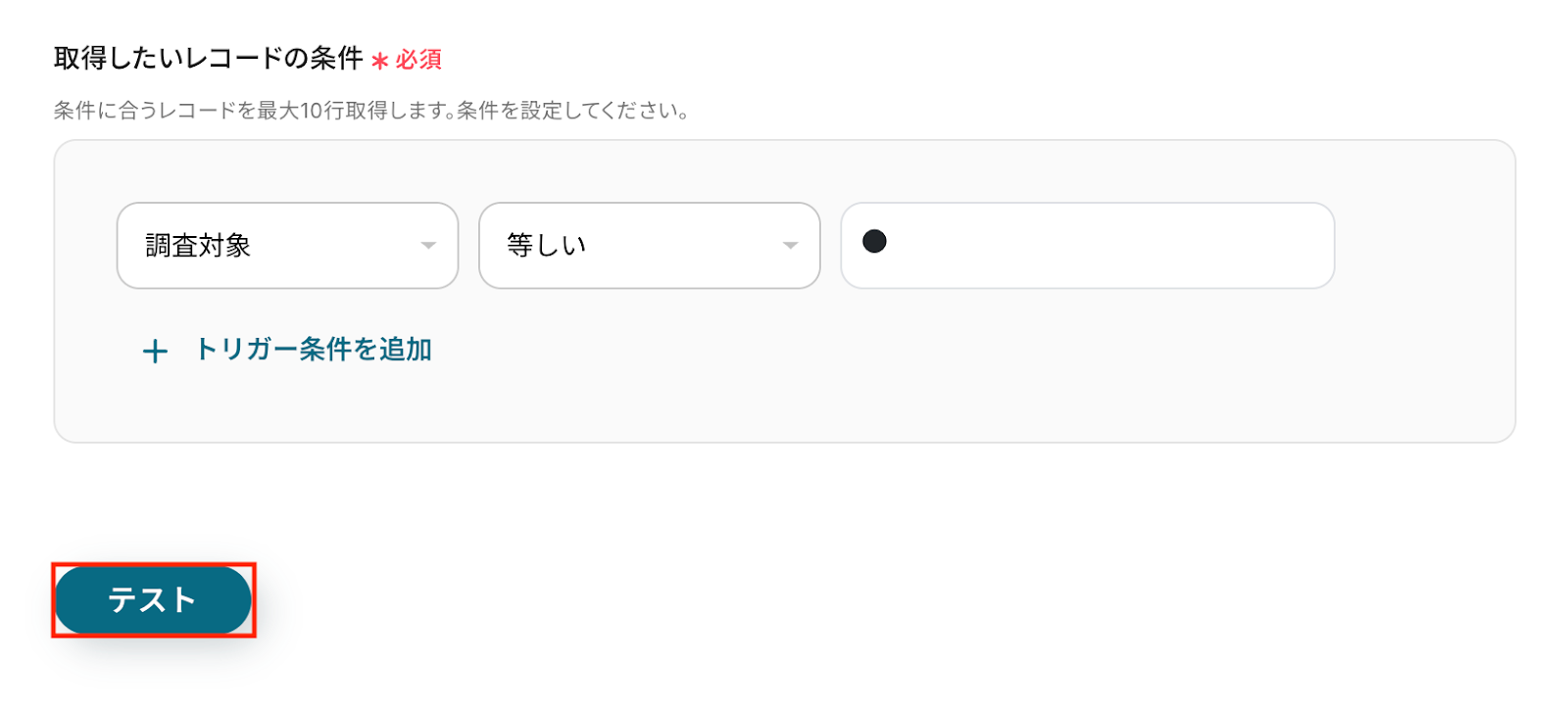 入力が完了したら「テスト」をクリックして、設定した内容でレコードが正しく取得されるか確認しましょう。