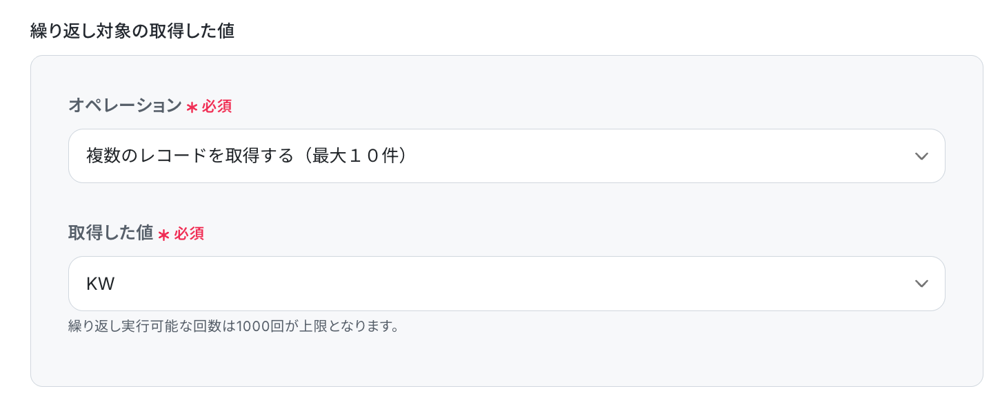 オペレーションには「複数のレコードを取得する(最大10件)」を選択し、取得した値には繰り返し対象となる配列データ(例:KW)を指定します。