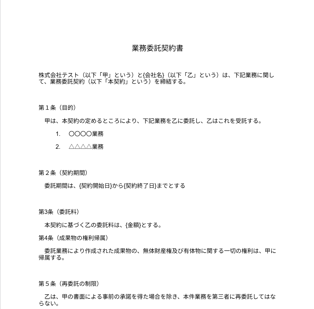 置換条件の設定 を行います。雛形書類の設定は以下のリンク先を参照して作成してください。「書類を発行する」の設定方法 今回は、例として以下のような雛形書類を使用しています。