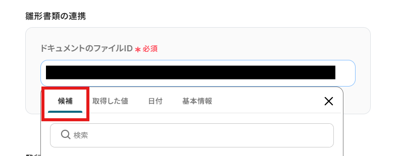 雛形書類の連携: 入力欄をクリックすると以下のように候補が表示されるので、その中から選択しましょう。
