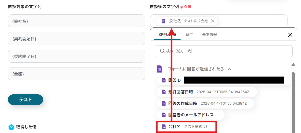置換後の文字列と置換対象の文字列を選択しましょう。 置換後の文字列は入力欄をクリックして、「フォームに回答が送信されたら」の欄から引用していきます。 設定が終わったらテストをクリックします。