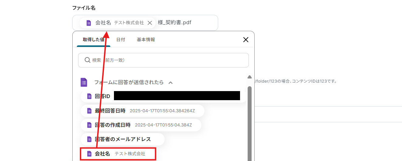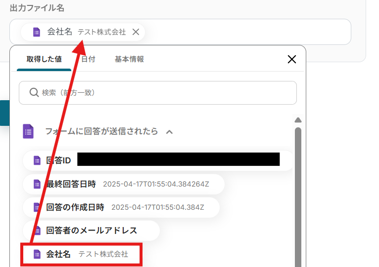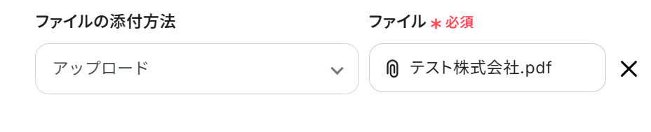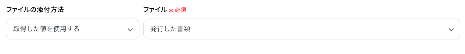 ファイルの添付方法: プルダウンで選択できます。取得した値を使用する場合は、ファイルは発行した書類を選択しましょう。