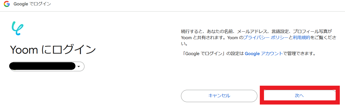 3. 以下の画面が出てきます。 連携するアカウントに問題がなければ、「次へ」をクリックしてください。