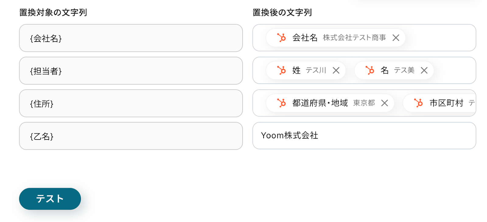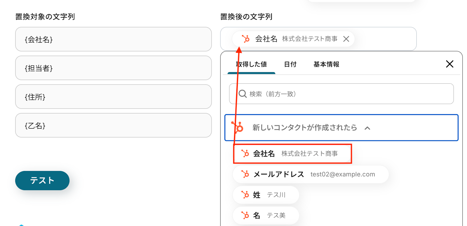 置換後の文字列欄をクリックすると、前のステップでHubSpotから取得した値が表示されるので、選択してマッピングしてください。