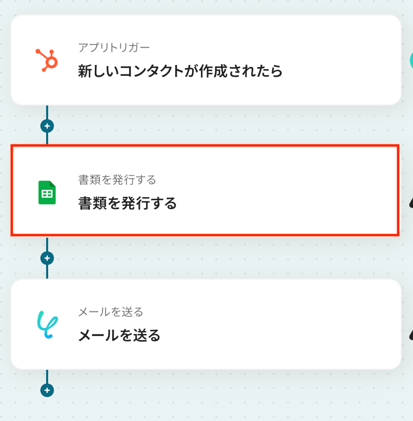 続いて、前のステップでHubSpotから取得した値を利用して、Google スプレッドシートで書類を発行しましょう。