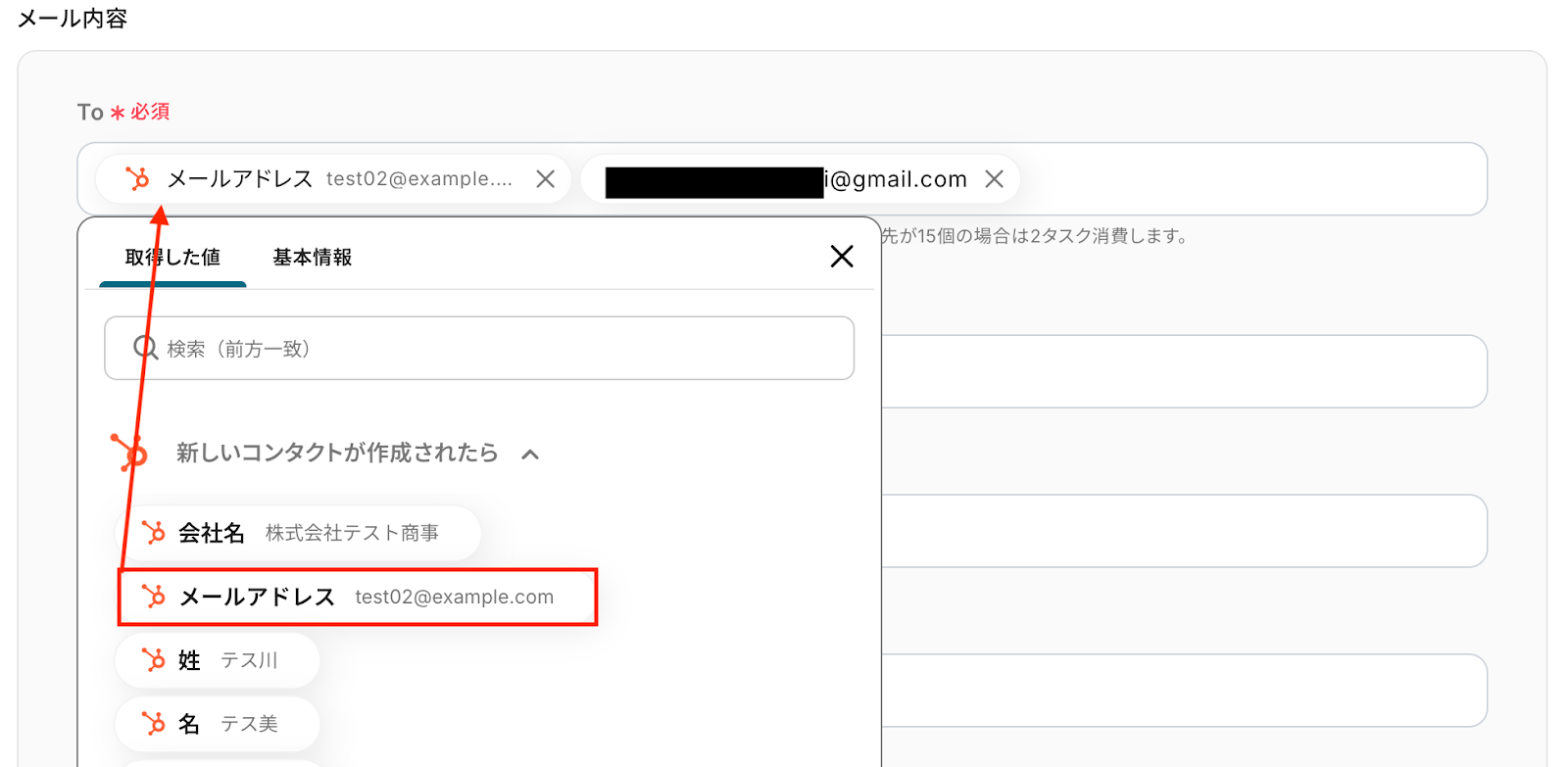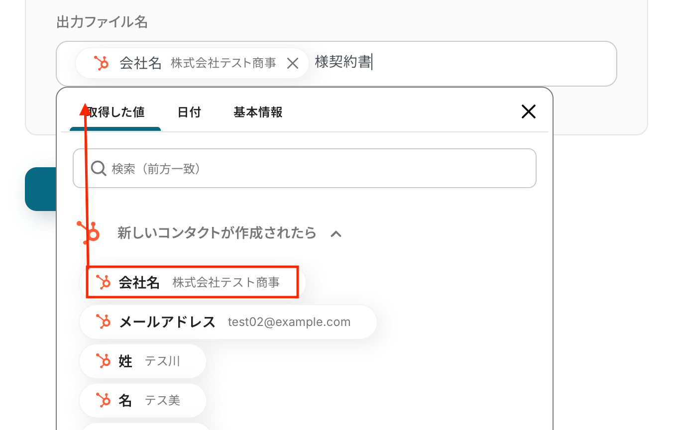 入力欄をクリックすると、前のステップでHubSpotから取得した値が表示されるので、選択して入力しましょう。