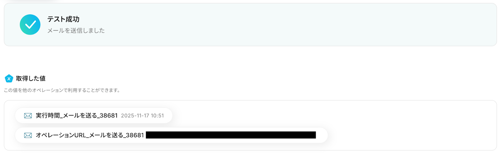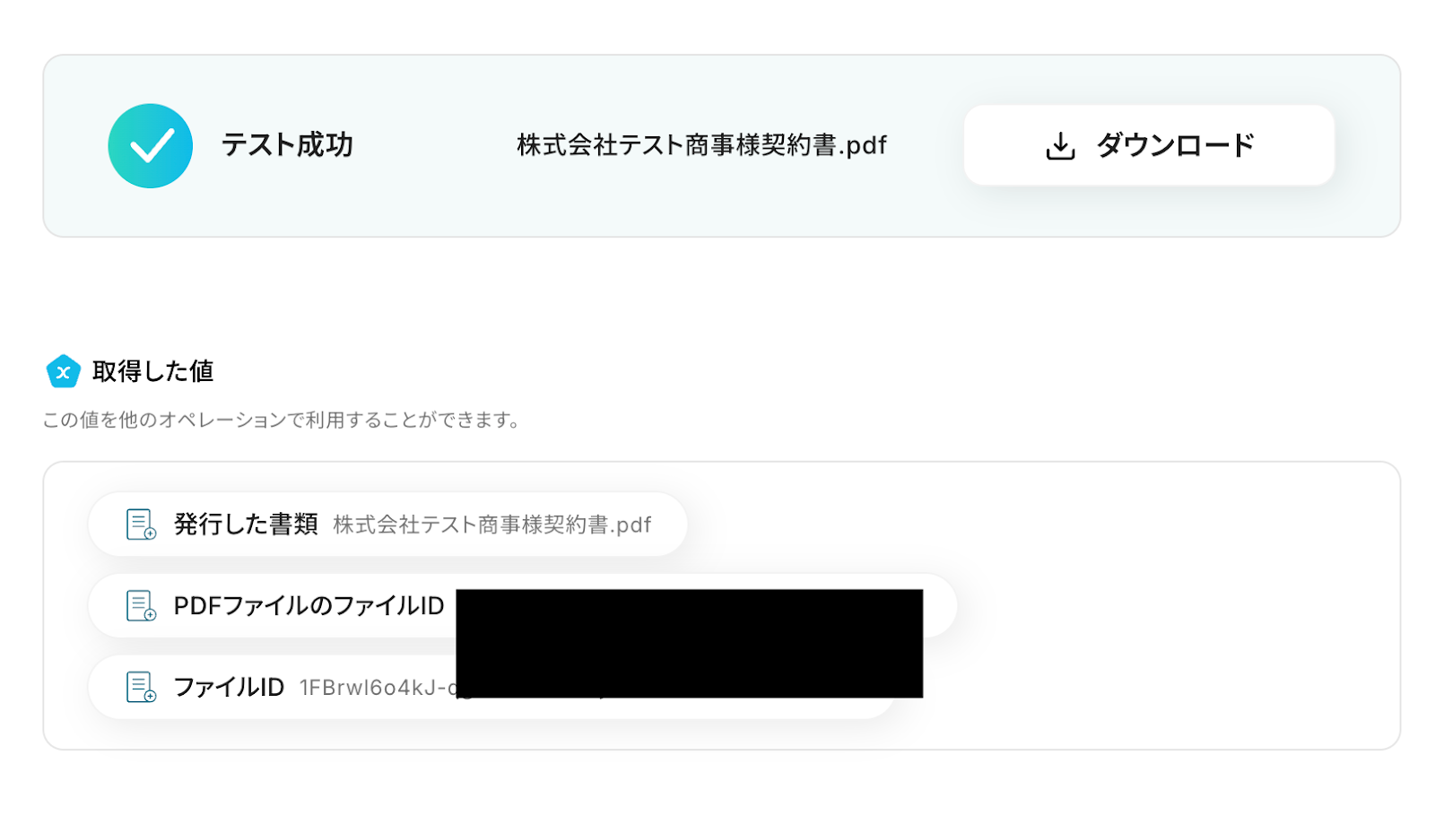 以下の画像の取得した値は、この後のステップでGoogle スプレッドシートで契約書類を発行する際に利用することができます。
