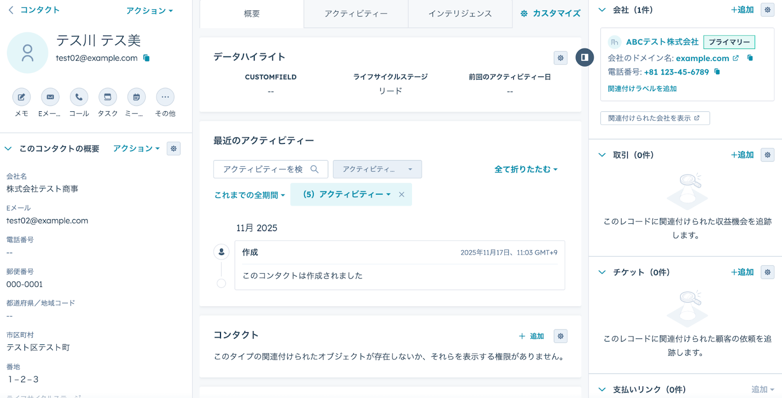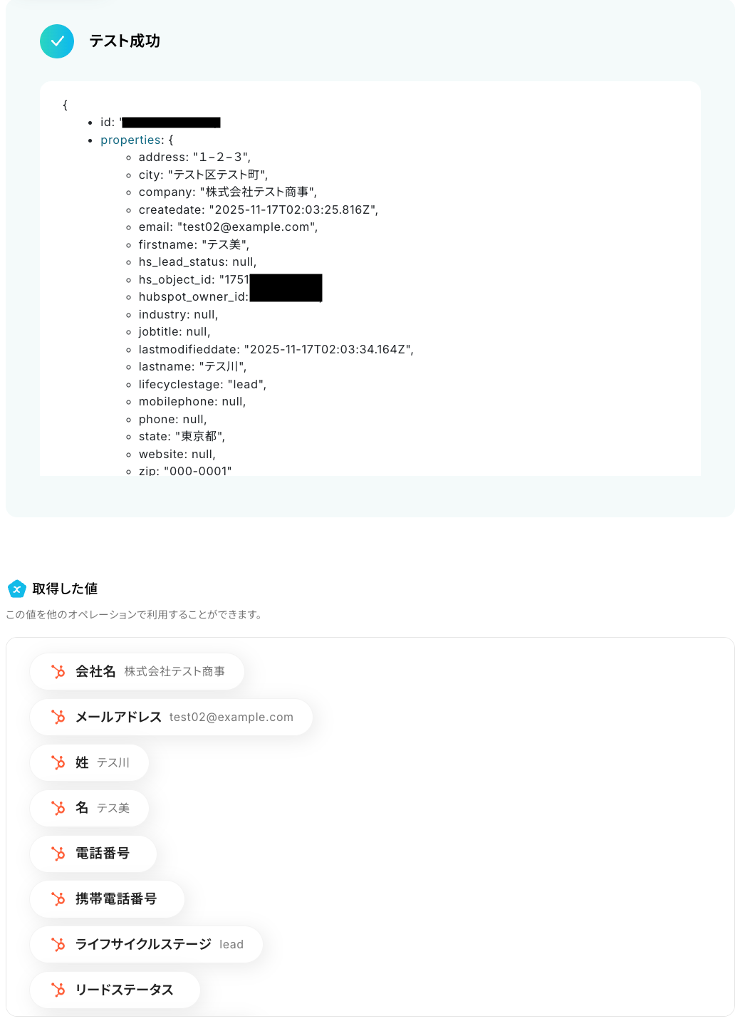 テストに成功すると、HubSpotに作成されたコンタクトに関する情報が一覧で表示されます。