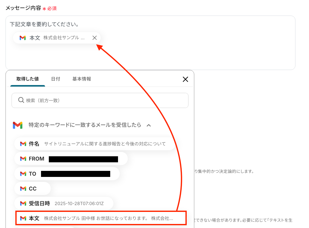 ここでは、ChatGPTを使って先ほど取得した値を要約する設定を行います。