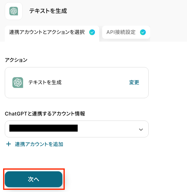 アクションはそのままで、連携するアカウント情報を確認します。