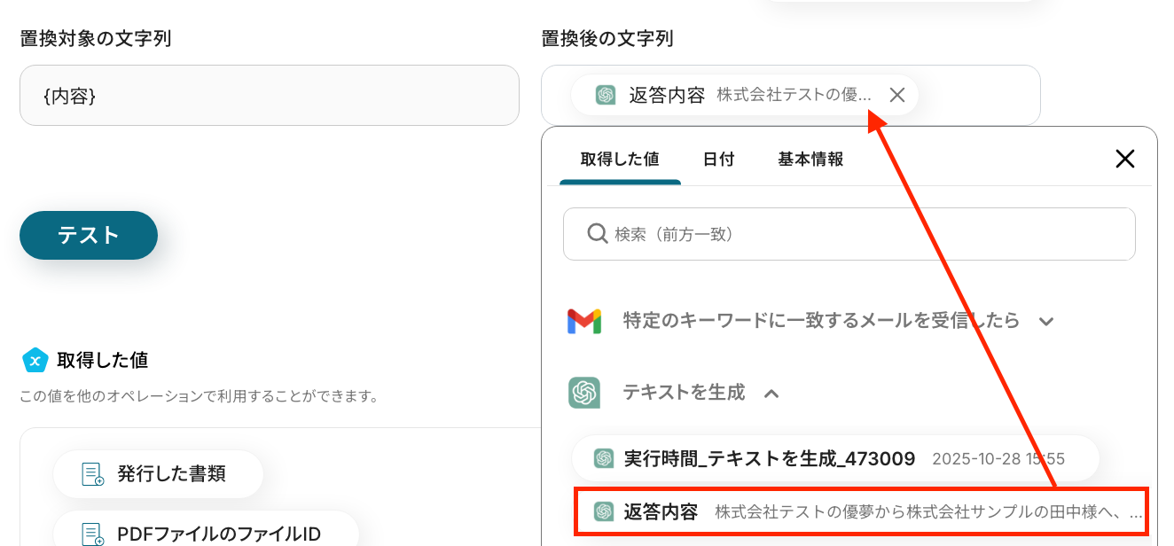 先ほど取得した値と任意で作成した文章を組み合わせて設定してください。