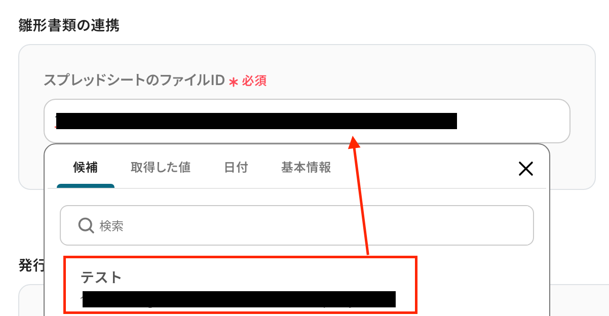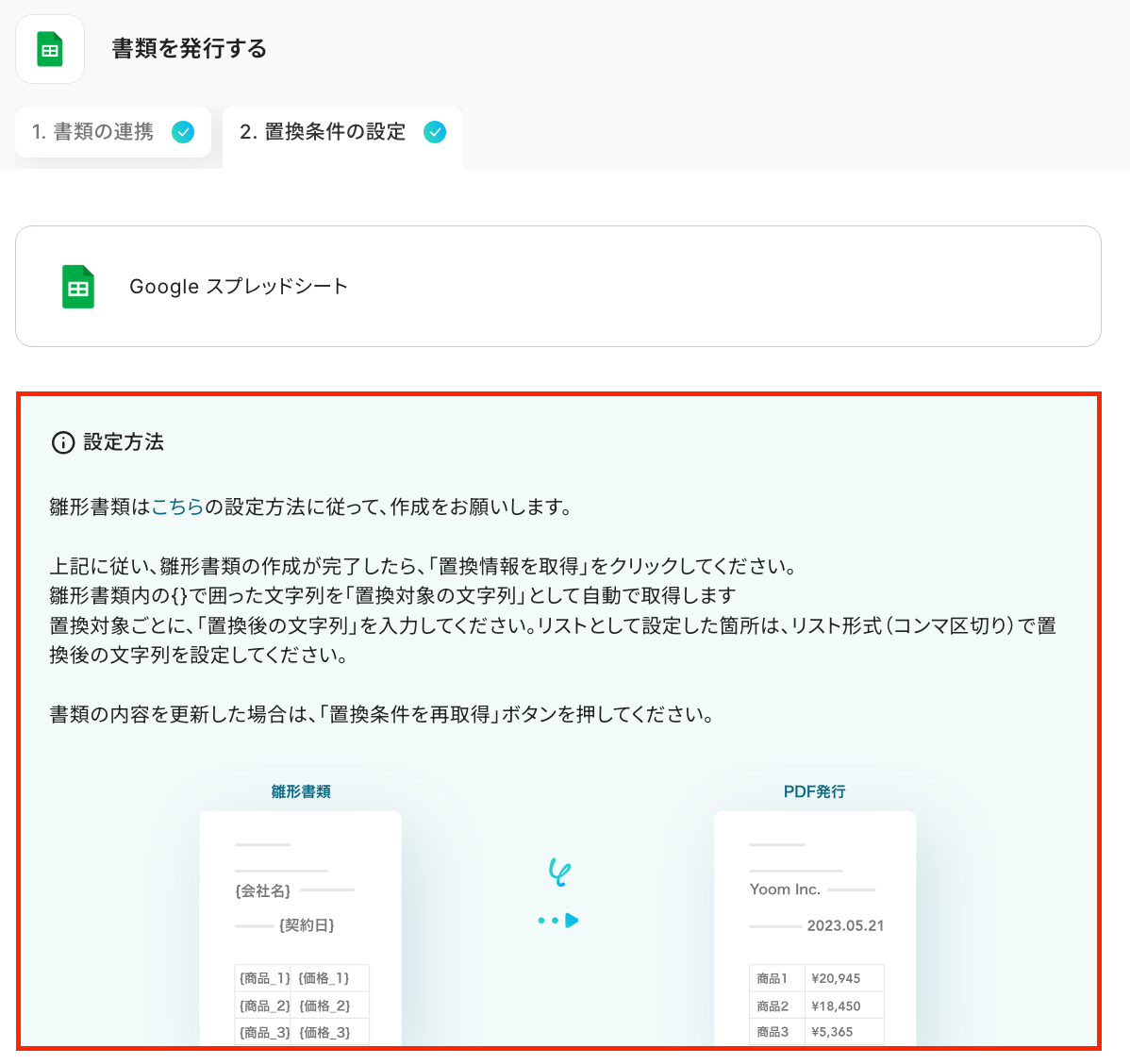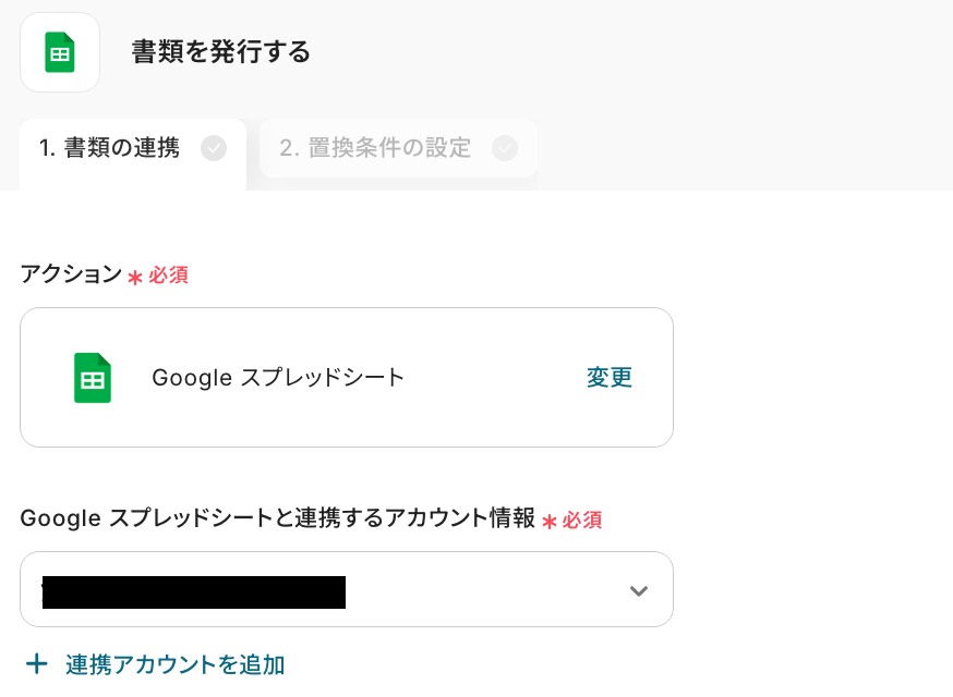 ここでは、Google スプレッドシートで書類を発行する設定です。