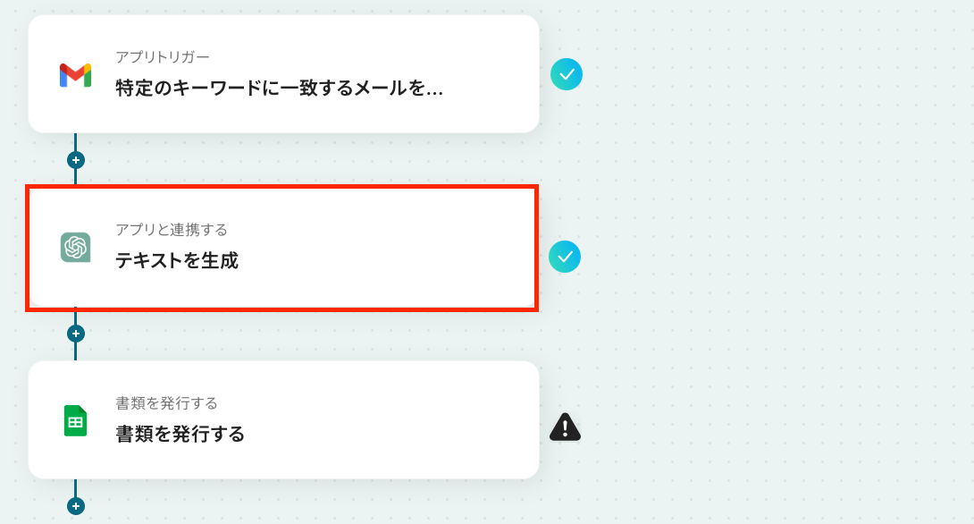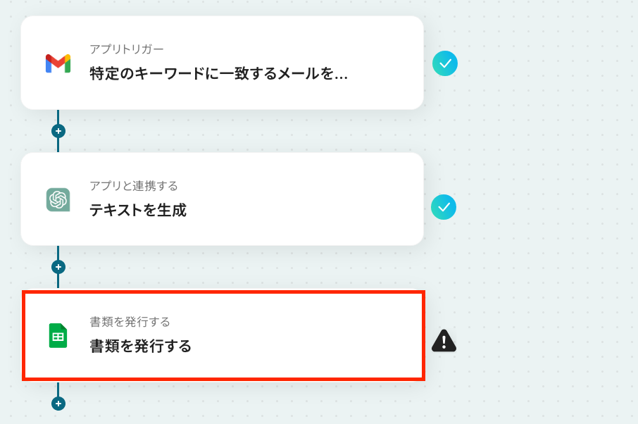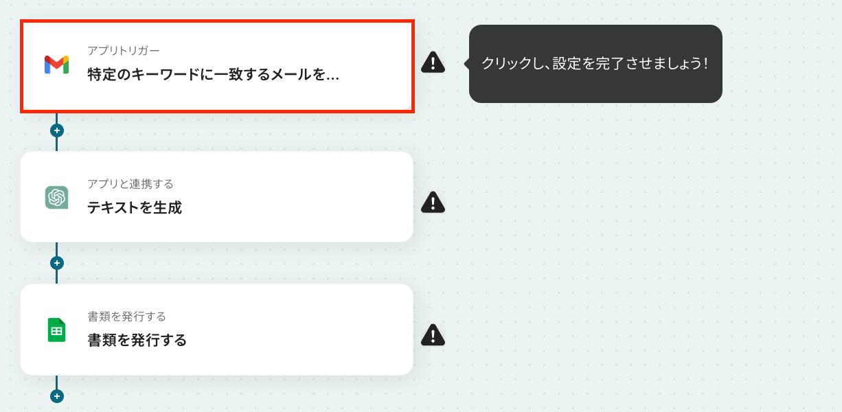ここから「Gmailで特定のキーワードに一致するメールを受信したら、ChatGPTで解析し結果をPDFとして保存する」フローを設定していきます。