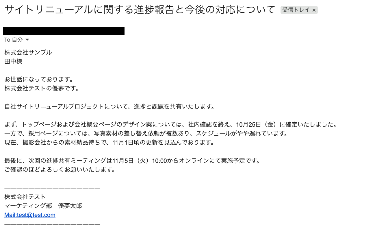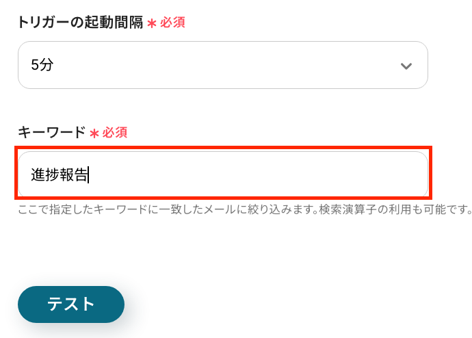 ※今回は、以下のメールを受け取った設定で進めていきます。キーワードは「進捗報告」に設定します。