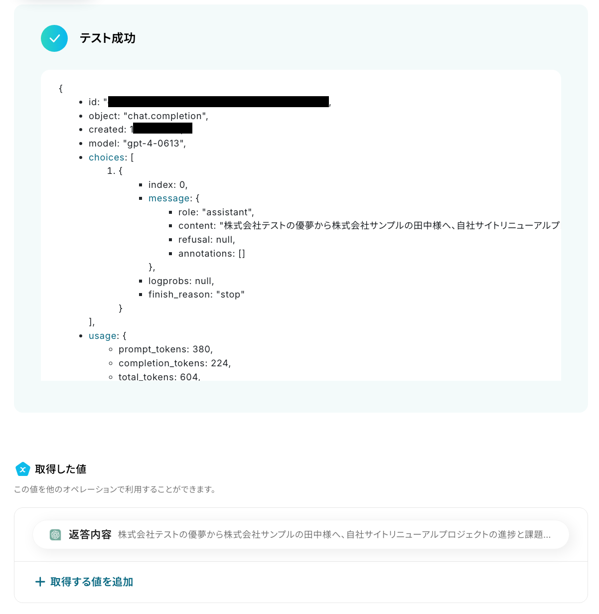 テストが成功すると、以下の画像のような取得した値が表示されます。