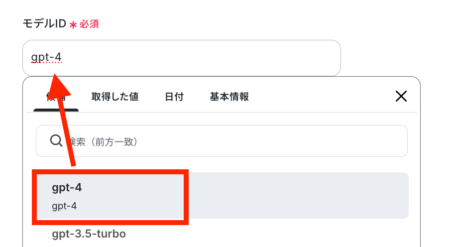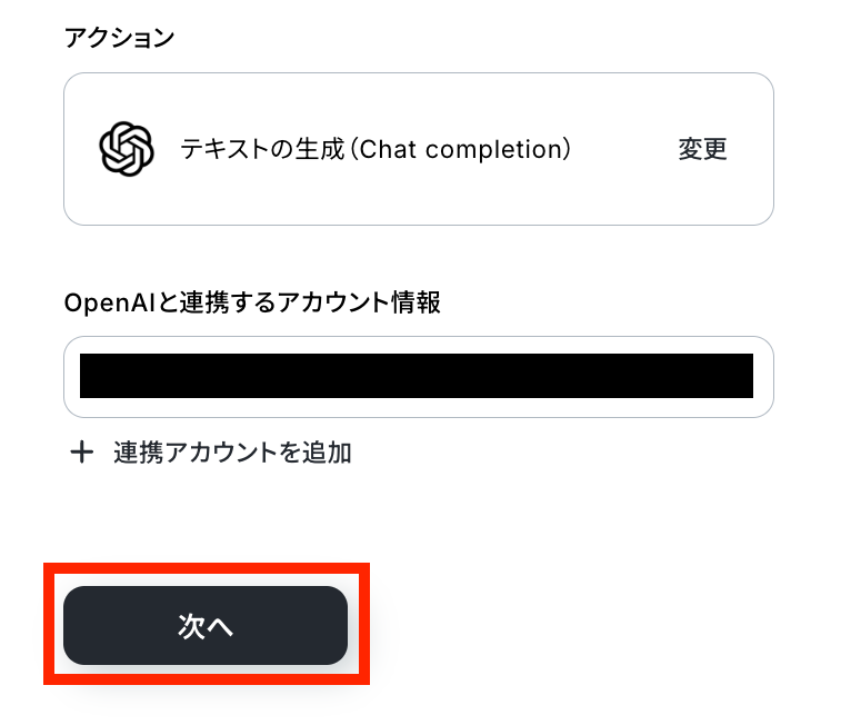 ステップ4:OpenAIのアクション設定 取得した値を利用して、OpenAIでテキストを生成する設定を行います。