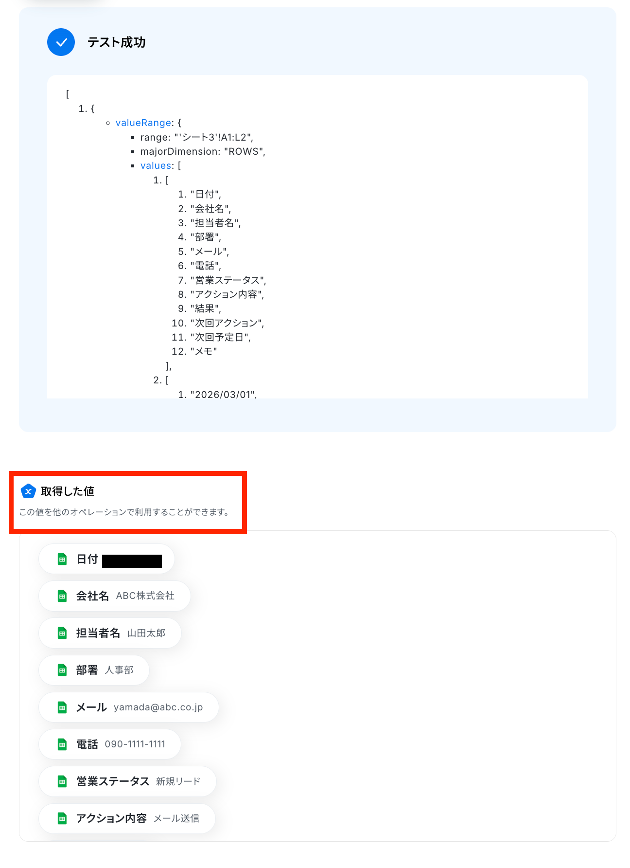 テスト成功で、取得した値 が取得されます。確認ができたら、「完了」ボタンを押して、最後に設定を保存しておきます。