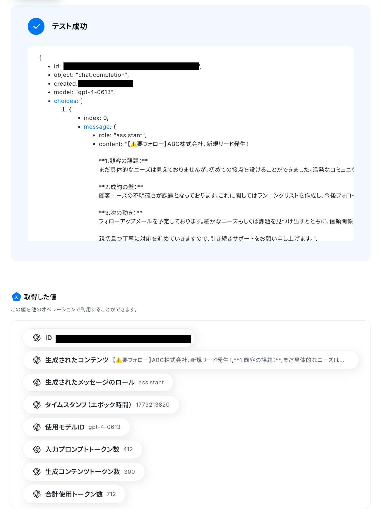 取得した値に要約されたテキスト情報が表示されていたら、テスト成功です!