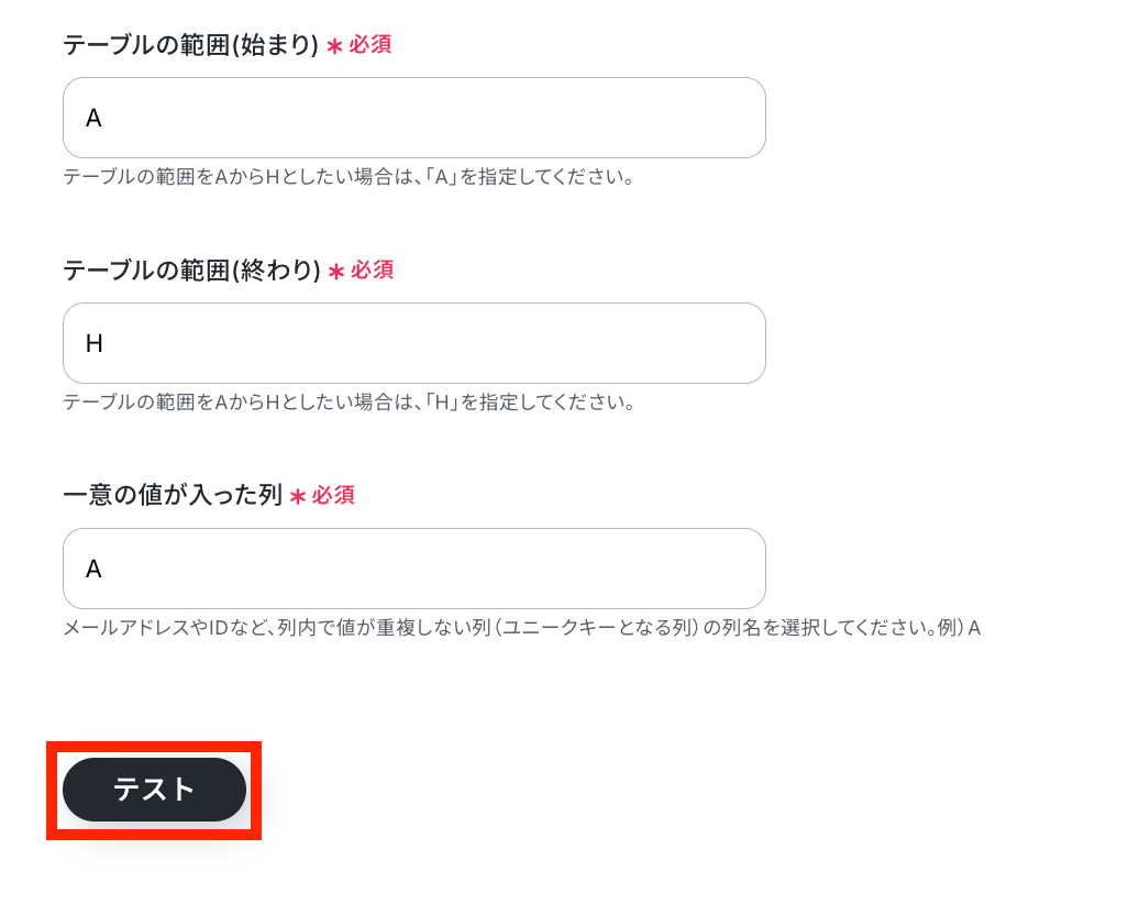 テーブルの範囲を指定したら、「テスト」ボタンを押します。