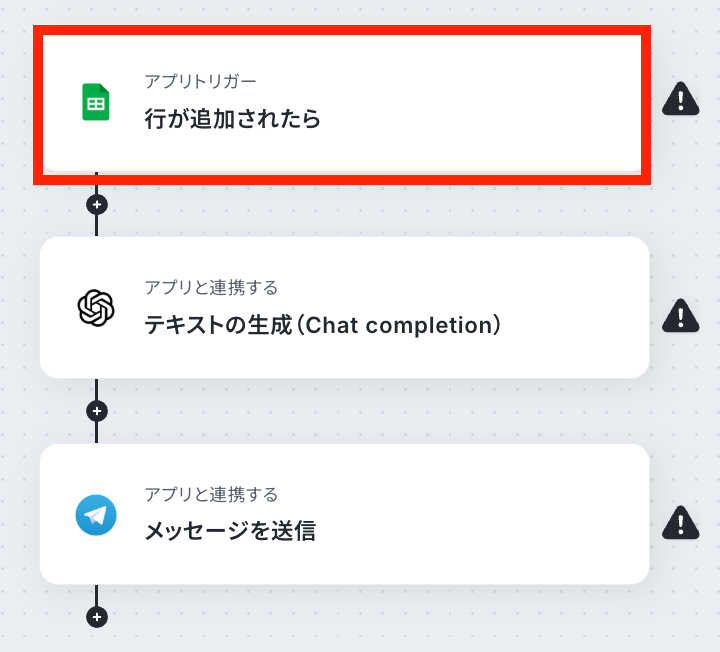 GoogleスプレッドシートのデータからAIで営業レポートを自動生成するフローを作ってみよう それではここから代表的な例として、Googleスプレッドシートに行が追加されたら、そのデータを基にOpenAIが営業レポートを自動で作成し、内容をTelegramで通知するフローを解説していきます!