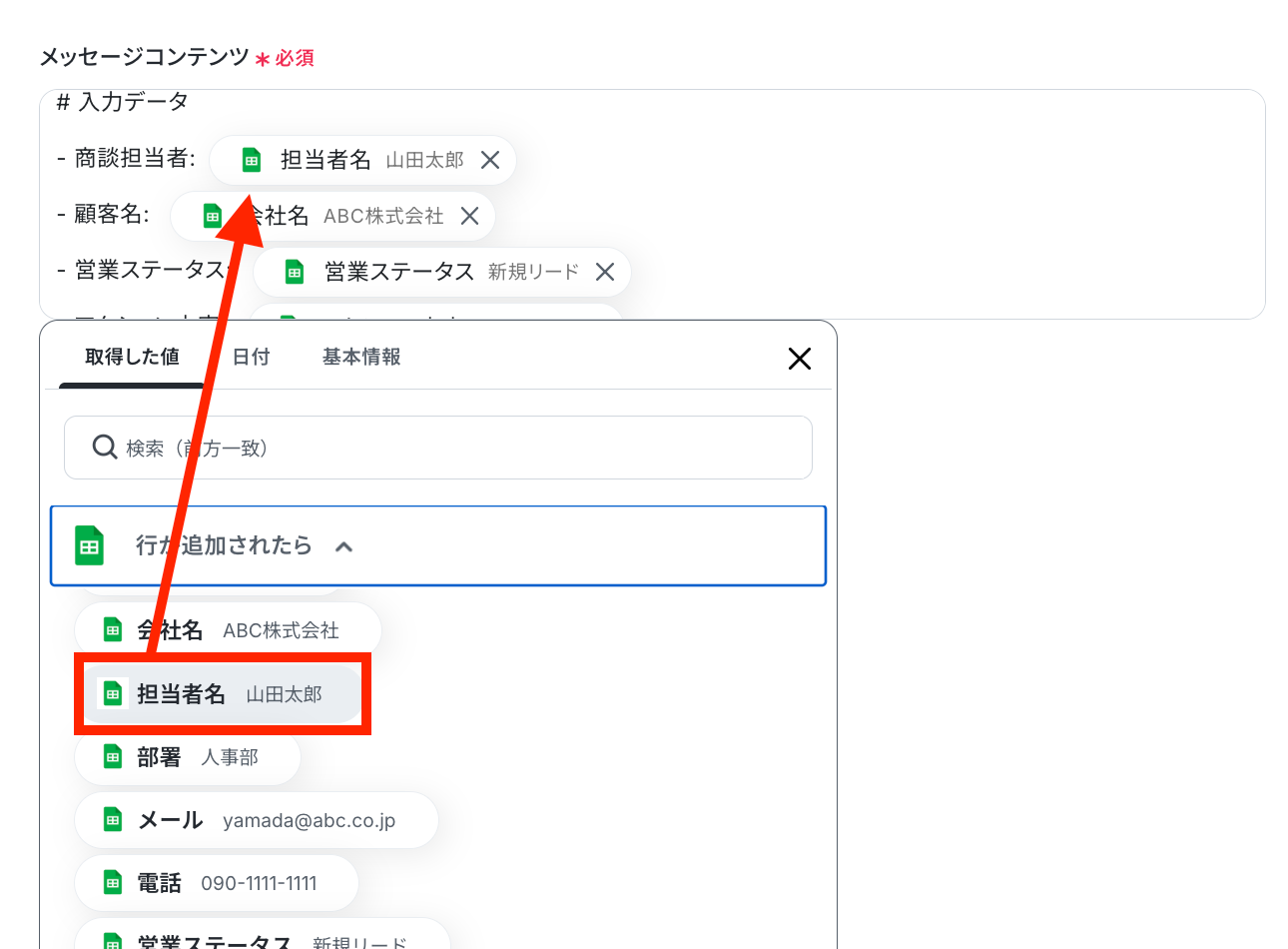 ※取得した値とは、トリガーやオペレーションにて受け取ったデータのことです。 取得した値は、後続のオペレーション設定時の値としてご利用いただくことができ、フローボットを起動する度に、変動した値となります。