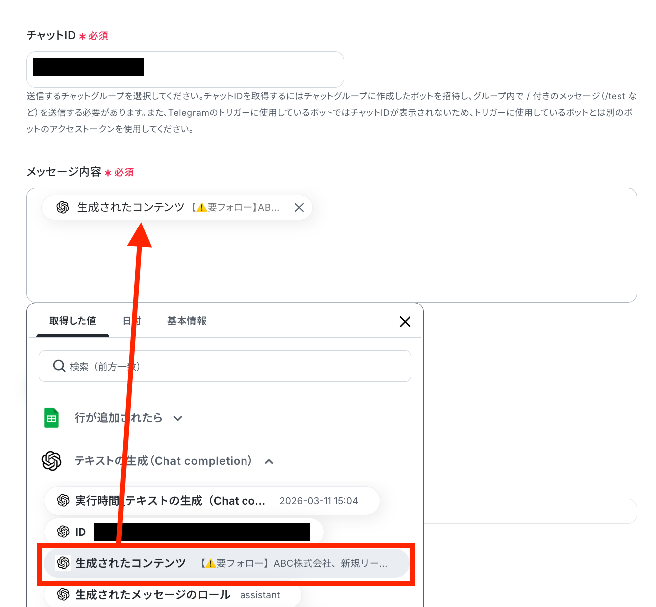 チャットIDは候補から設定します。 表示されない場合、該当のチャットで「/」付きのメッセージを送信してください。 メッセージ内容は先ほど取得した値を活用して設定します。
