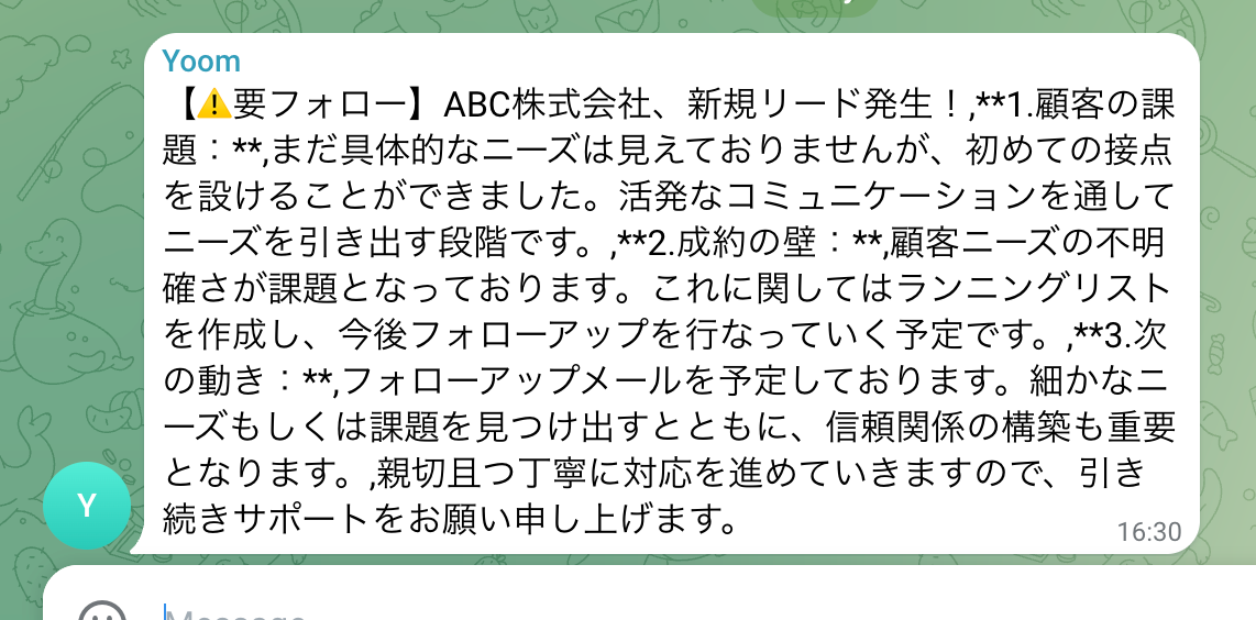# 指示 あなたは優秀な営業マネージャーです。 以下のスプレッドシートに入力された商談データを解析し、チームメンバーがTelegram上で一目で状況を把握できる「営業速報レポート」を生成してください。# 入力データ - 商談担当者:{{担当者名}} - 顧客名: {{顧客名}} - 商談ステータス: {{商談ステータス}} - ヒアリング内容: {{ヒアリング詳細}} - ネクストアクション:{{ネクストアクション}}# 出力ルール 1. 冒頭に適切な絵文字をつけて、一言で状況を要約すること(例:【🔥アツい!】や【⚠️要フォロー】など) 2. 「顧客の課題」「成約の壁」「次の動き」の3点を箇条書きで簡潔にまとめること 3. Telegramで読みやすいよう、適度に改行を入れること 4. 専門用語は分かりやすく、報告書らしい丁寧な敬語(です・ます調)で出力すること 5. 結論を先出しすること
