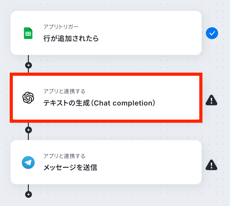 Google スプレッドシートのトリガー設定とOpenAI、Telegramのアクション設定