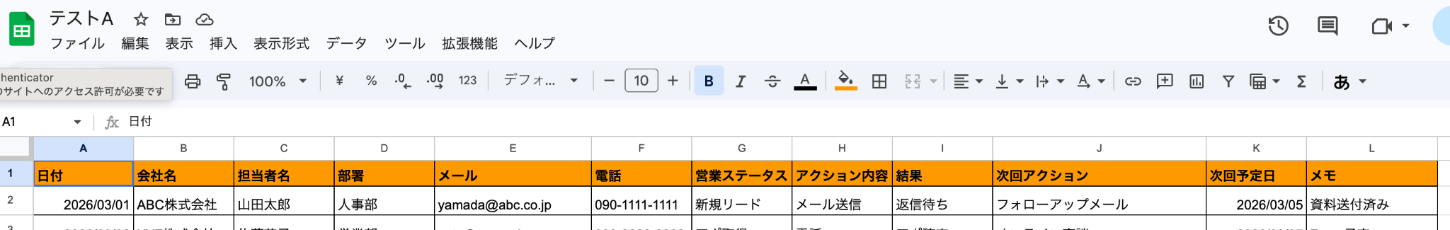 テストで使用する営業レポートの作成をGoogle スプレッドシート上で行います。 今回は次のような営業レポートを用意しました!