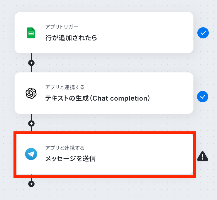ステップ5:Telegramのアクション設定 取得した値を利用して、Telegramでメッセージを送信する設定を行います。 最後の赤枠をクリックしましょう。